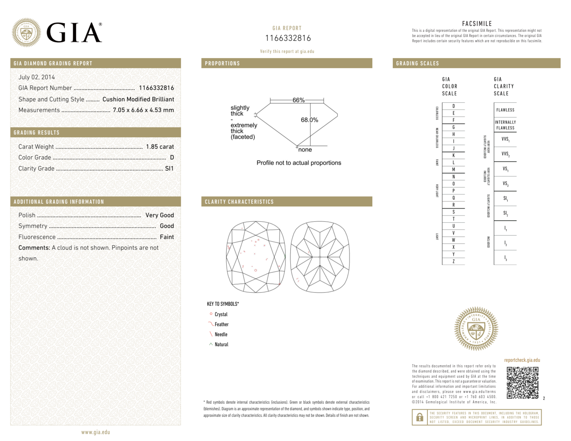 Your 1.85 carat Cushion natural diamond is graded D color (Colorless), and you can read more about D color diamonds here.