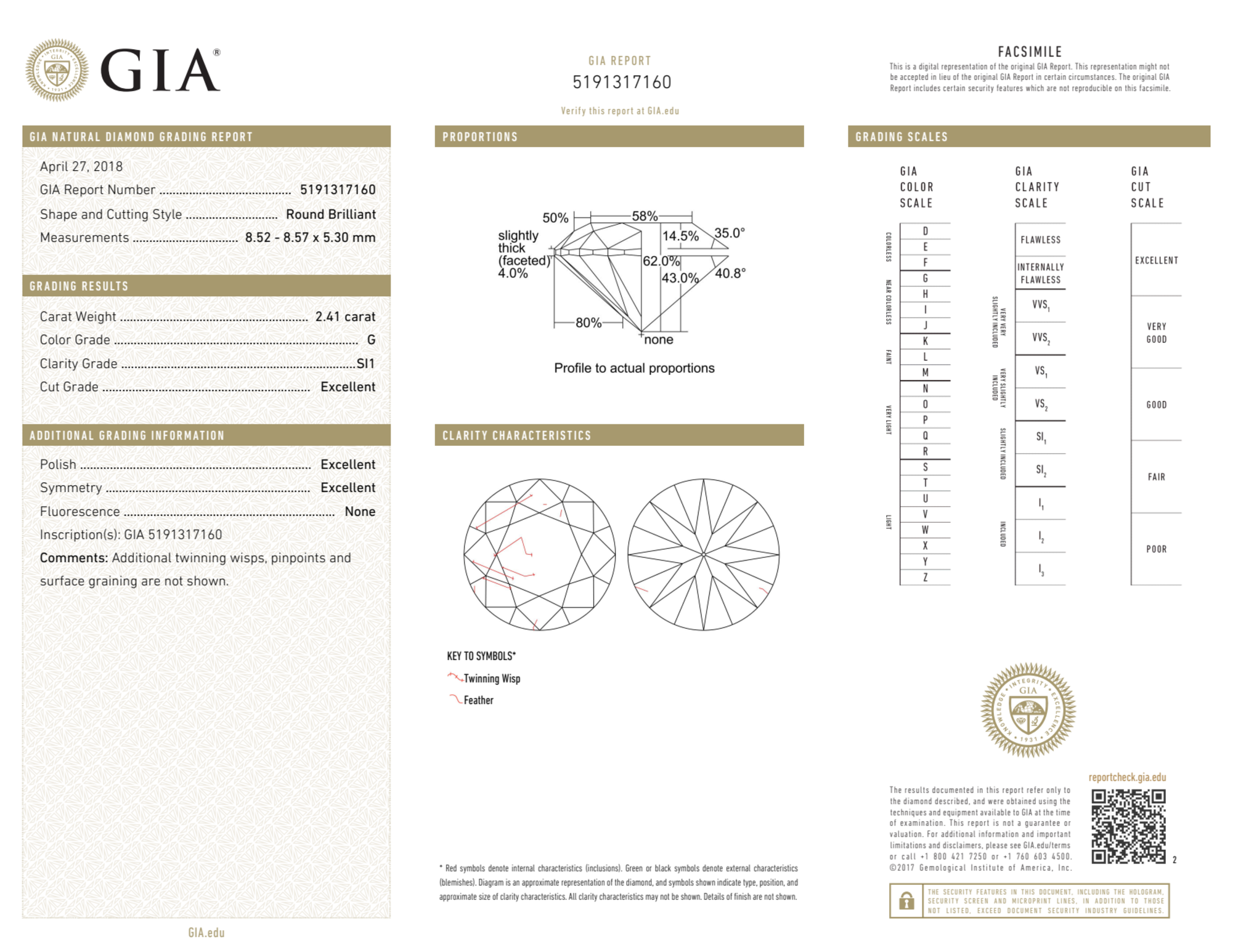 Your 2.41 carat Round natural diamond is graded SI1 clarity, which stands for Slightly Included 1. Read more about SI1 clarity diamonds here, or learn more about diamond clarity in general here.