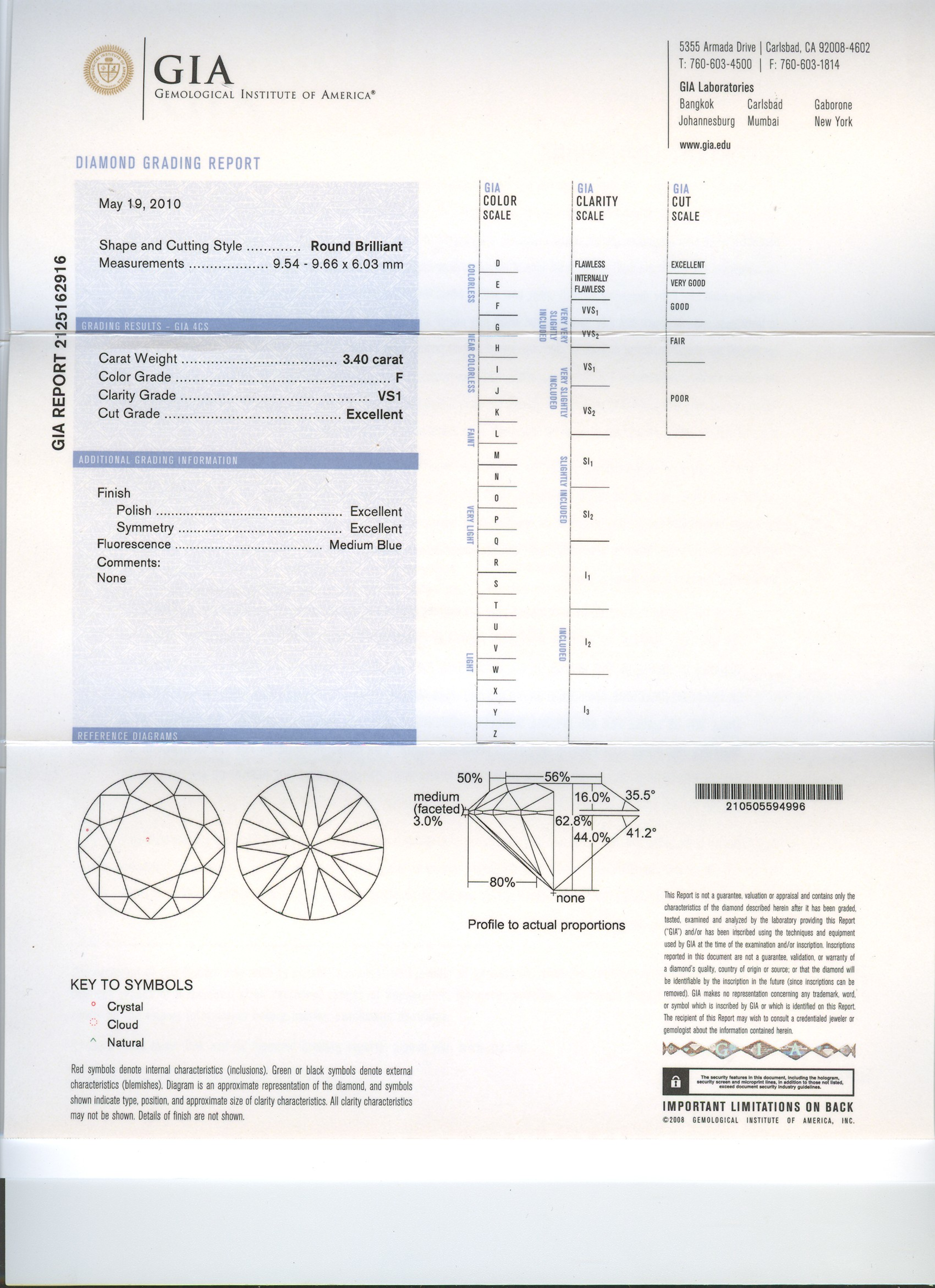 Your 3.40 carat Round natural diamond is graded F color (Colorless), and you can read more about F color diamonds here.