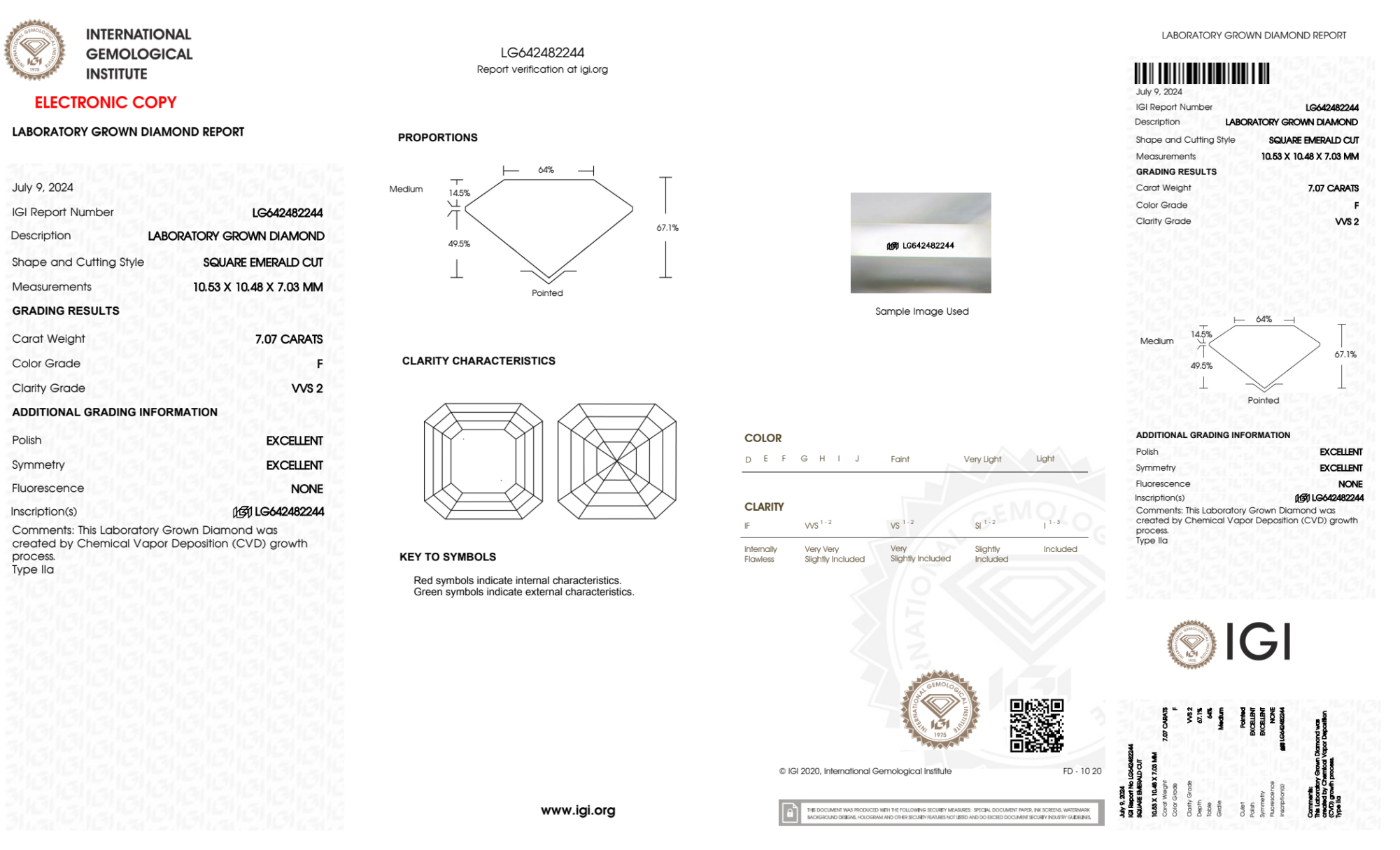 Your 7.07 carat Asscher lab diamond is graded F color (Colorless), and you can read more about F color diamonds here.