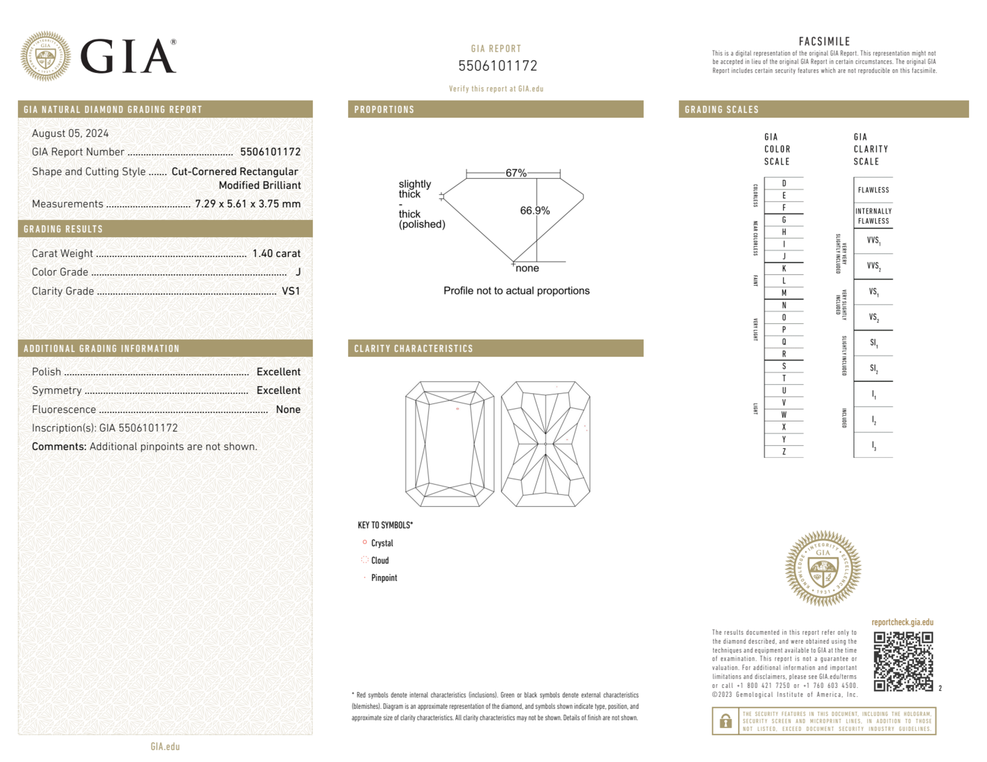Your 1.40 carat Radiant natural diamond is graded J color (Near Colorless), and you can read more about J color diamonds here.
