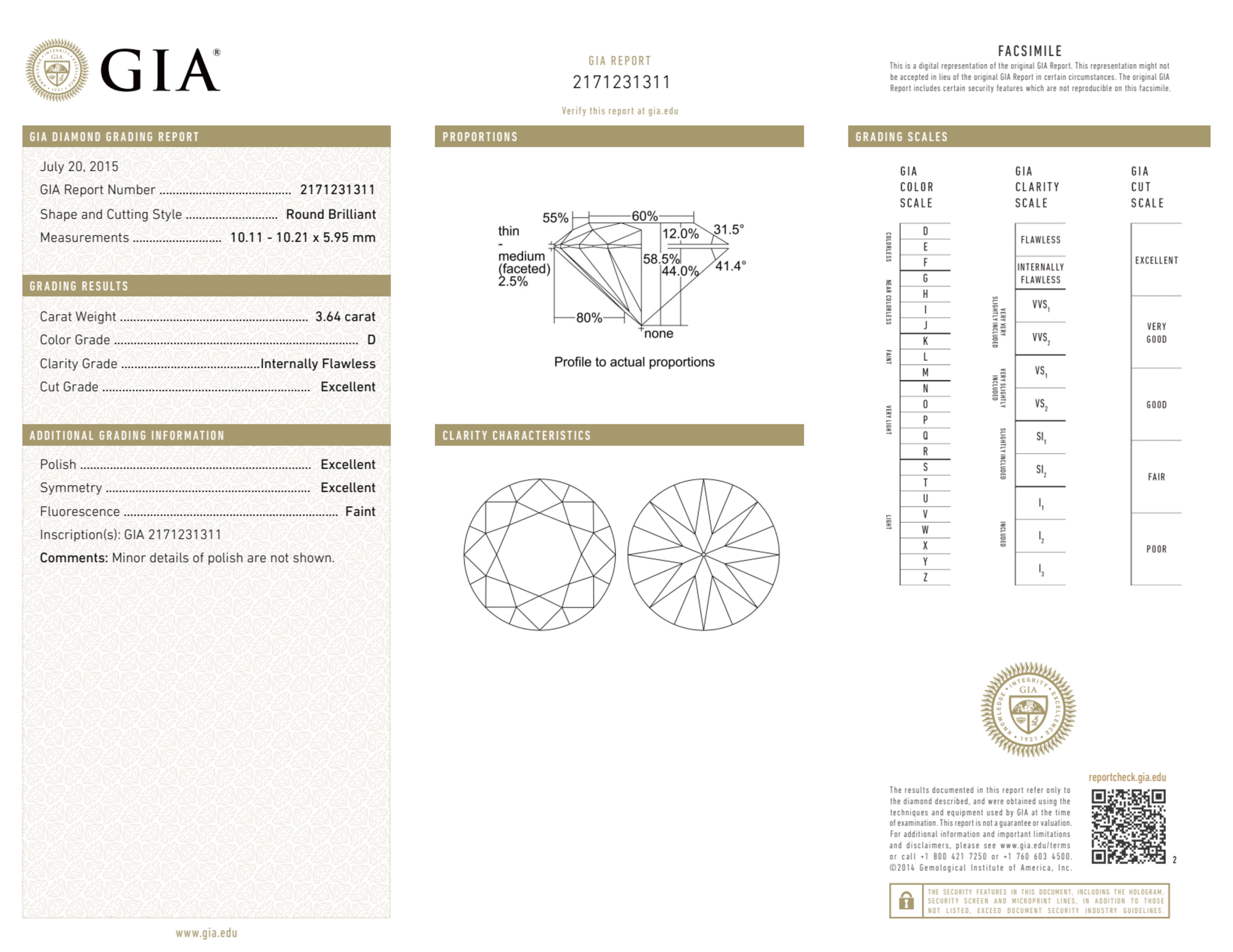 Your 3.64 carat Round natural diamond is graded IF clarity, which stands for Internally Flawless. Read more about IF clarity diamonds here, or learn more about diamond clarity in general here.