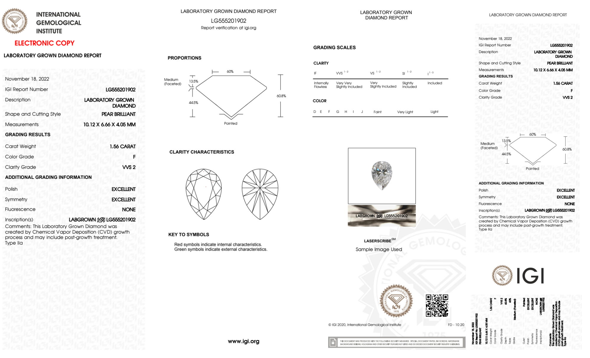 Your 1.56 carat Pear lab diamond is graded F color (Colorless), and you can read more about F color diamonds here.