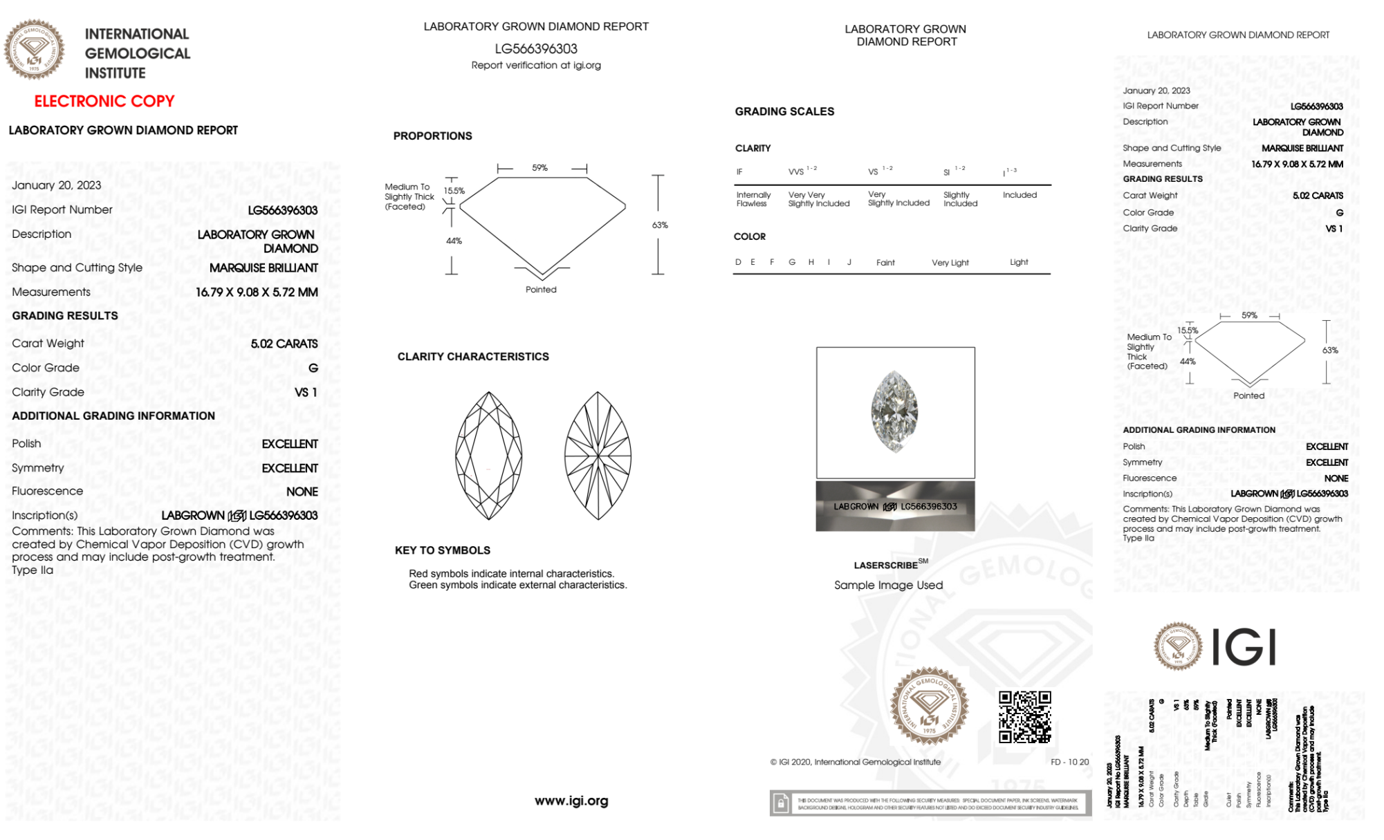 Your 5.02 carat Marquise lab diamond is graded G color (Near Colorless), and you can read more about G color diamonds here.