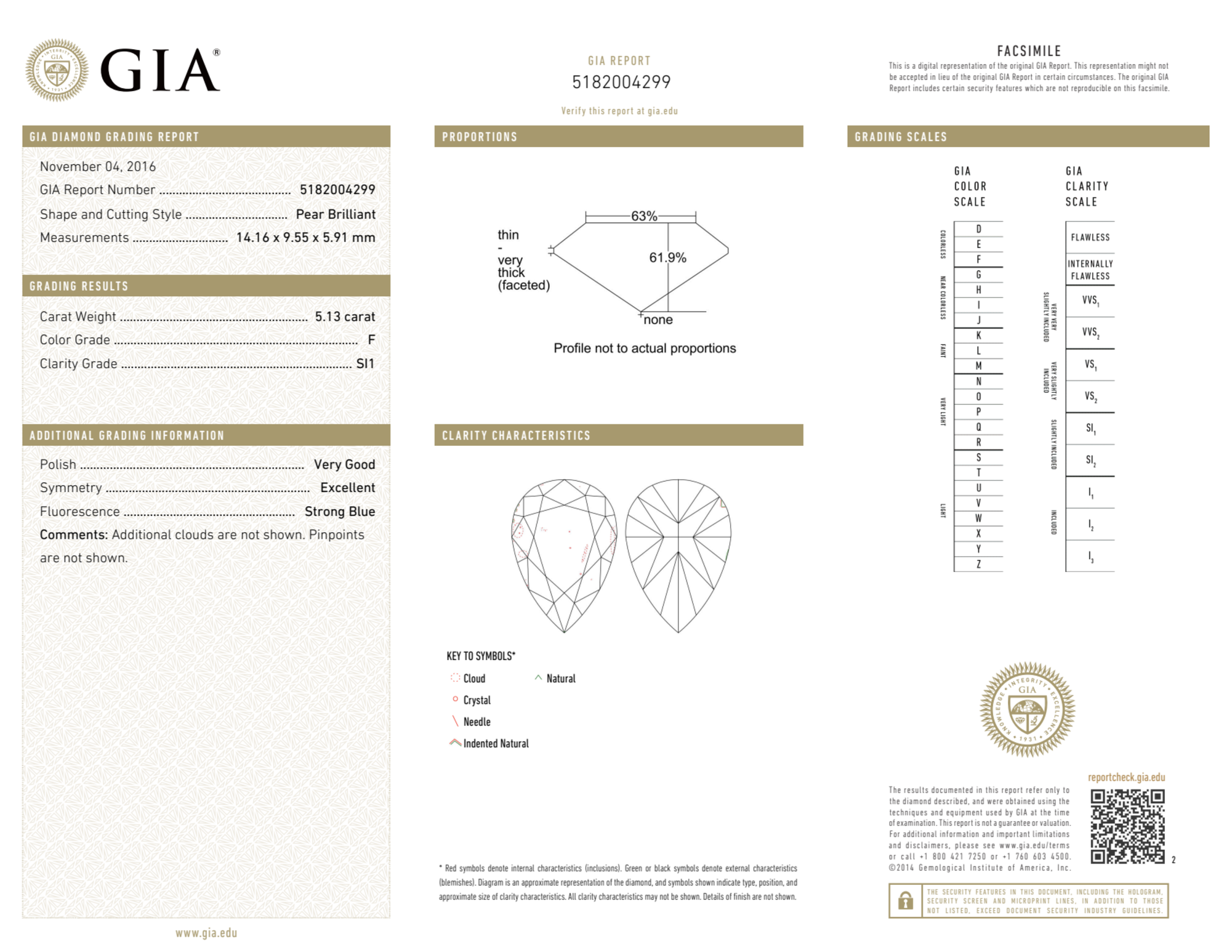 Your 5.13 carat Pear natural diamond is graded F color (Colorless), and you can read more about F color diamonds here.