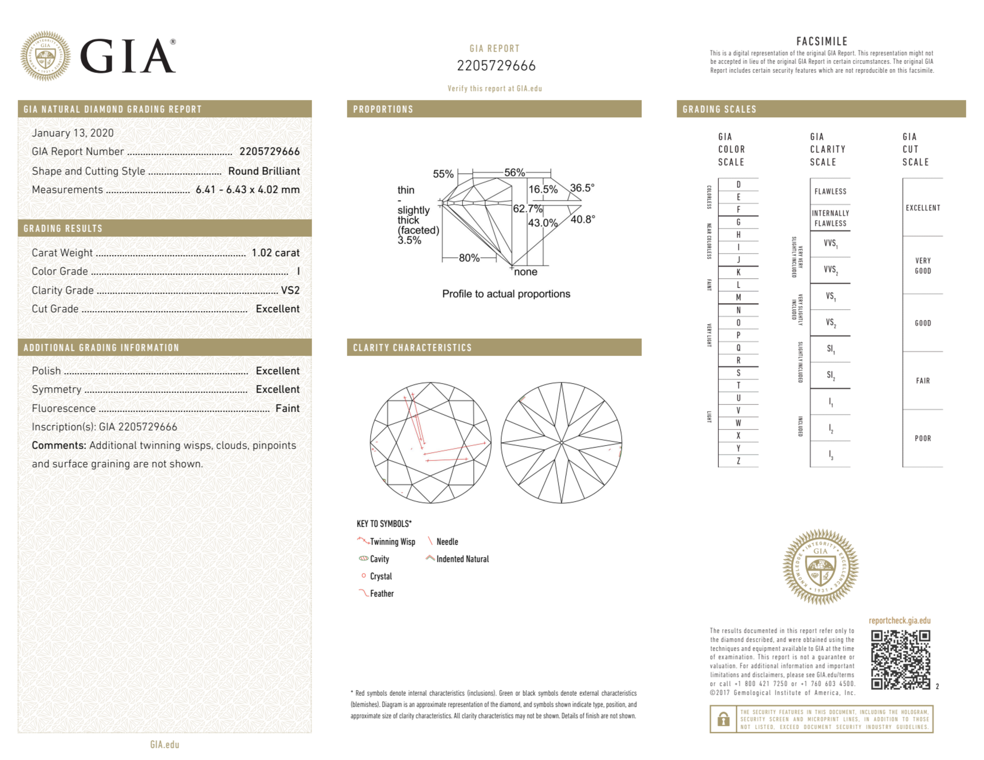 Your 1.02 carat Round natural diamond is graded VS2 clarity, which stands for Very Slightly Included 2. Read more about VS2 clarity diamonds here, or learn more about diamond clarity in general here.