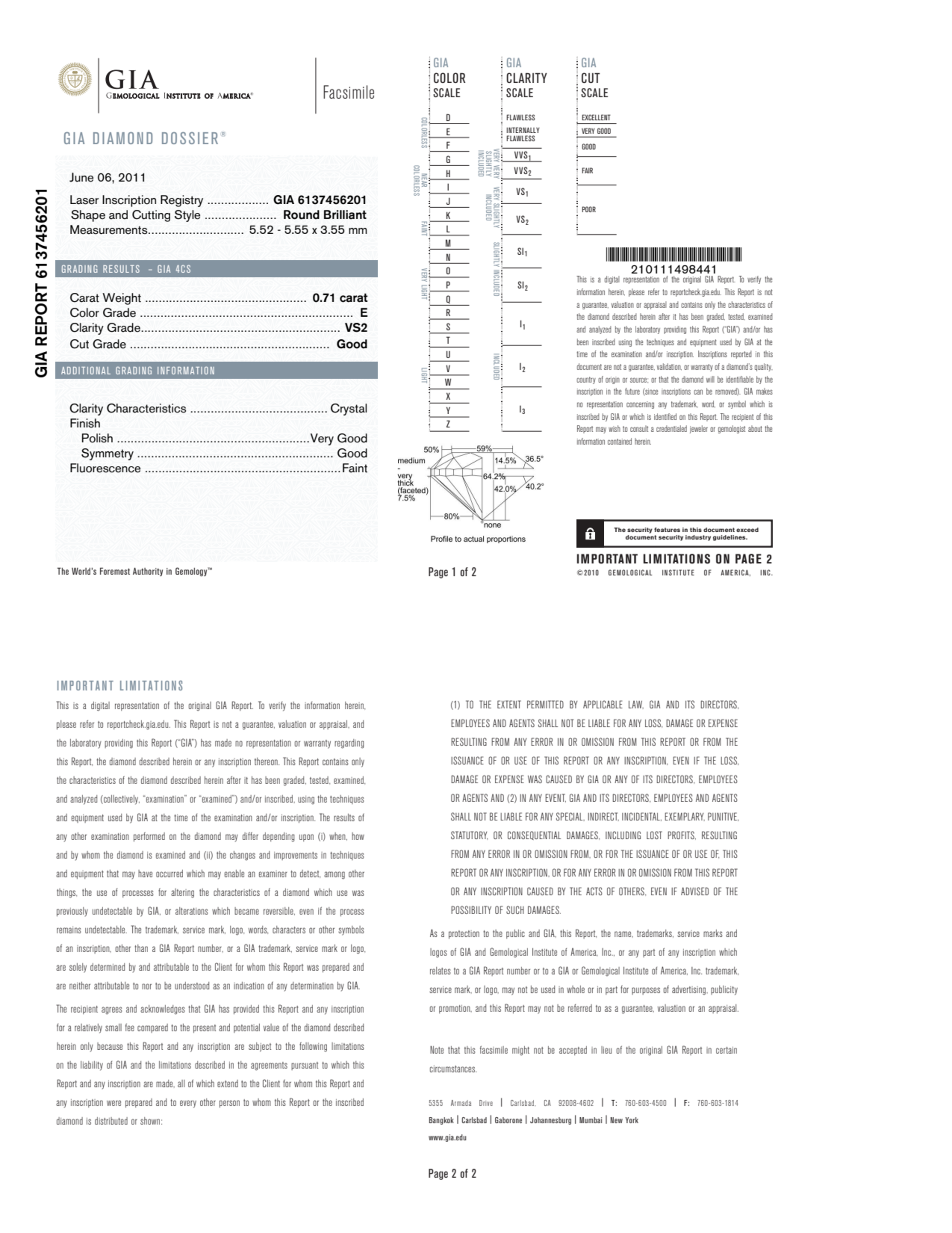 Your 0.71 carat Round natural diamond is graded E color (Colorless), and you can read more about E color diamonds here.
