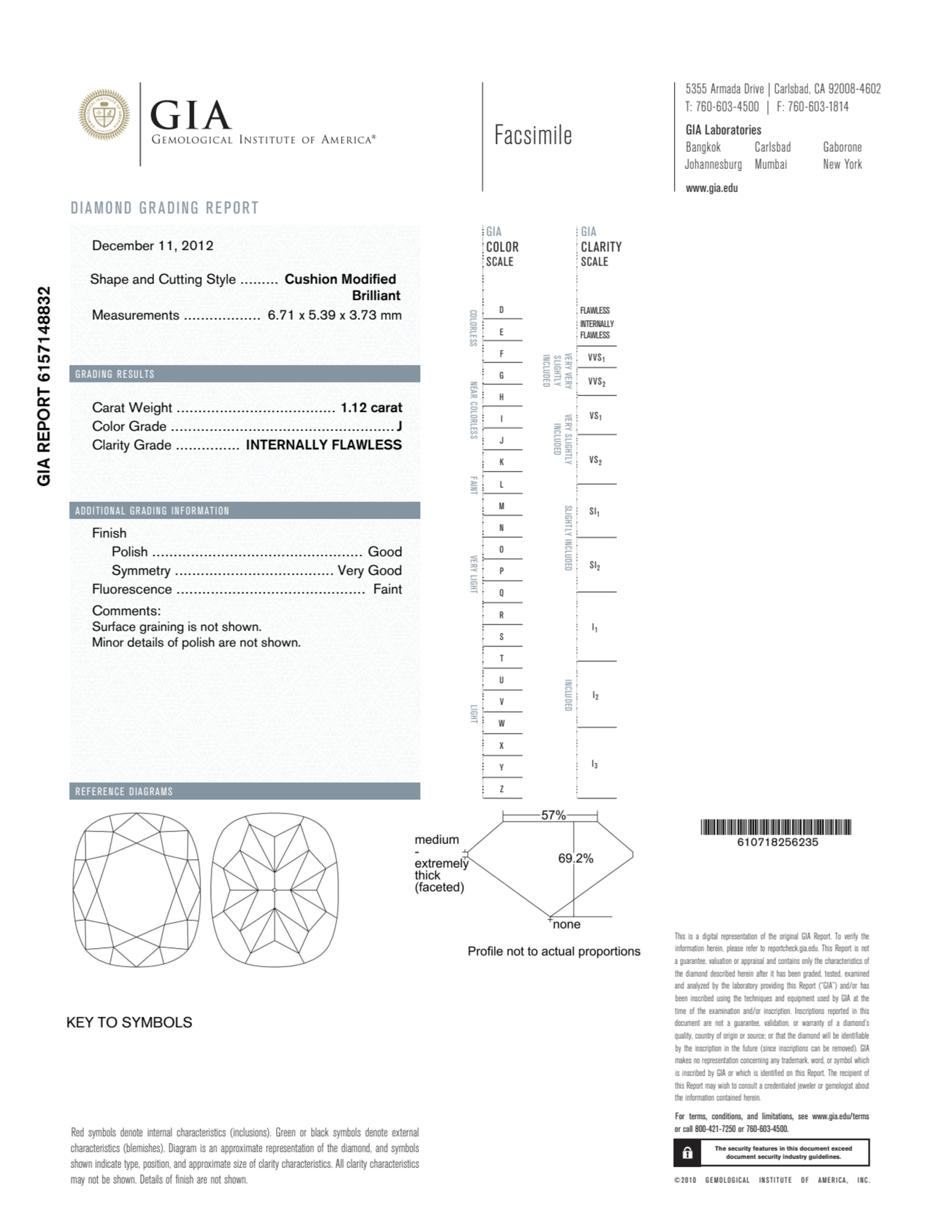 Your 1.12 carat Cushion natural diamond is graded IF clarity, which stands for Internally Flawless. Read more about IF clarity diamonds here, or learn more about diamond clarity in general here.