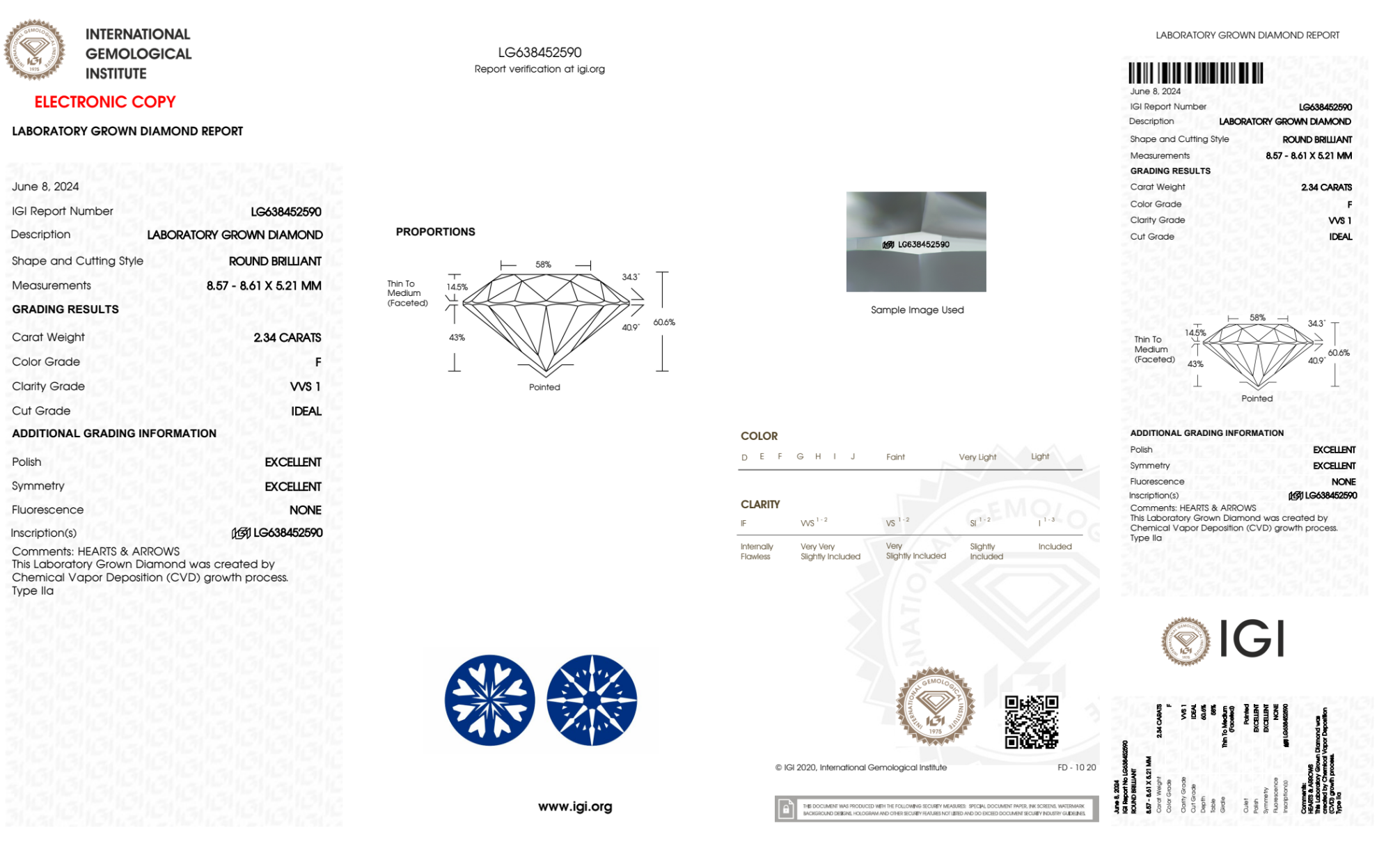 Your 2.34 carat Round lab diamond is graded VVS1 clarity, which stands for Very Very Slightly Included 1. Read more about VVS1 clarity diamonds here, or learn more about diamond clarity in general here.