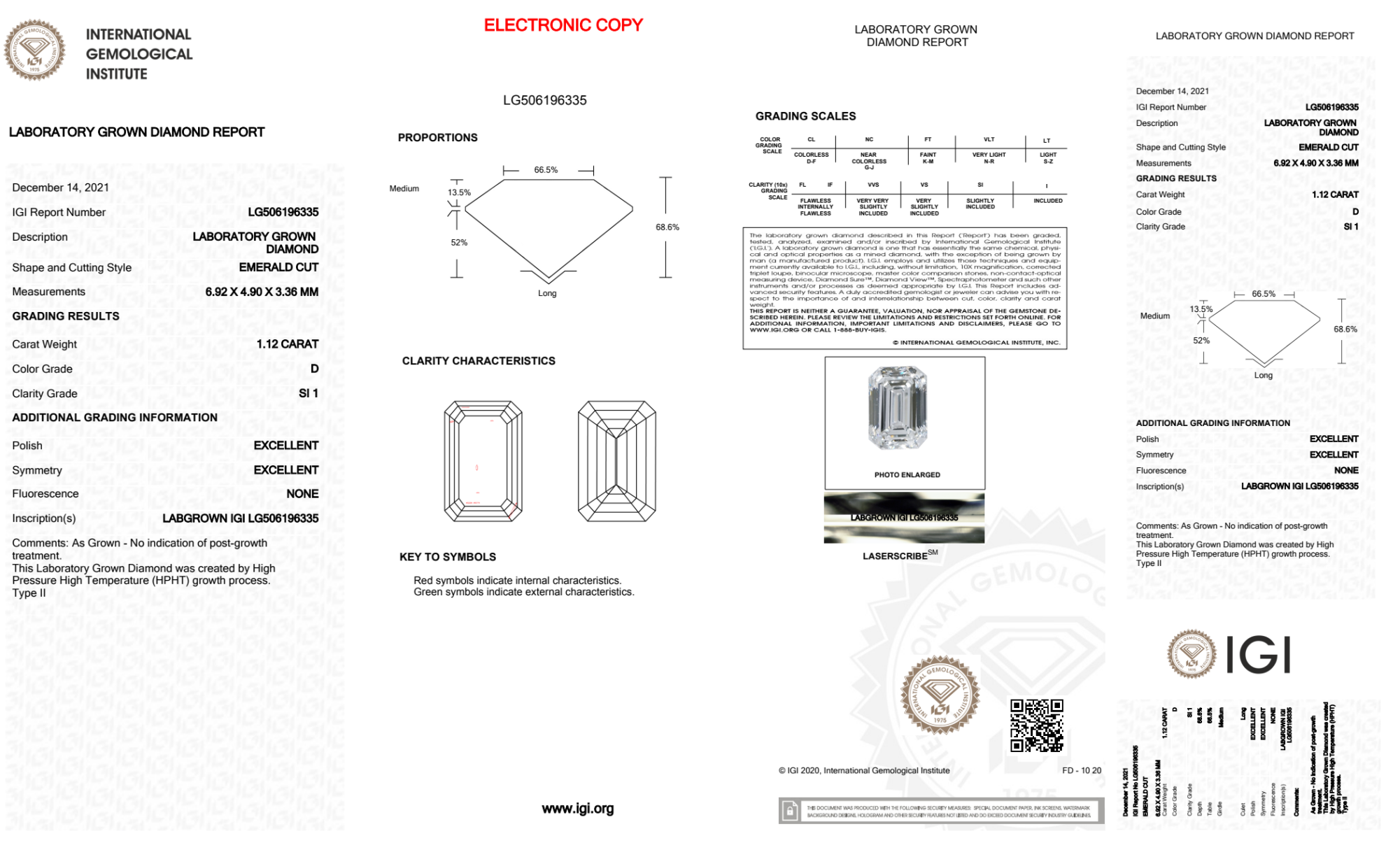 Your 1.12 carat Emerald lab diamond is graded D color (Colorless), and you can read more about D color diamonds here.