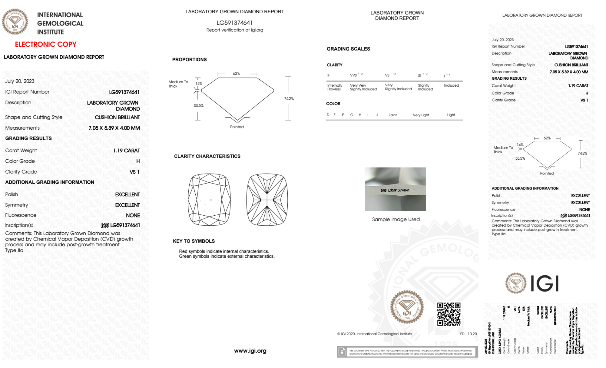 Your 1.19 carat Cushion lab diamond is graded H color (Near Colorless), and you can read more about H color diamonds here.