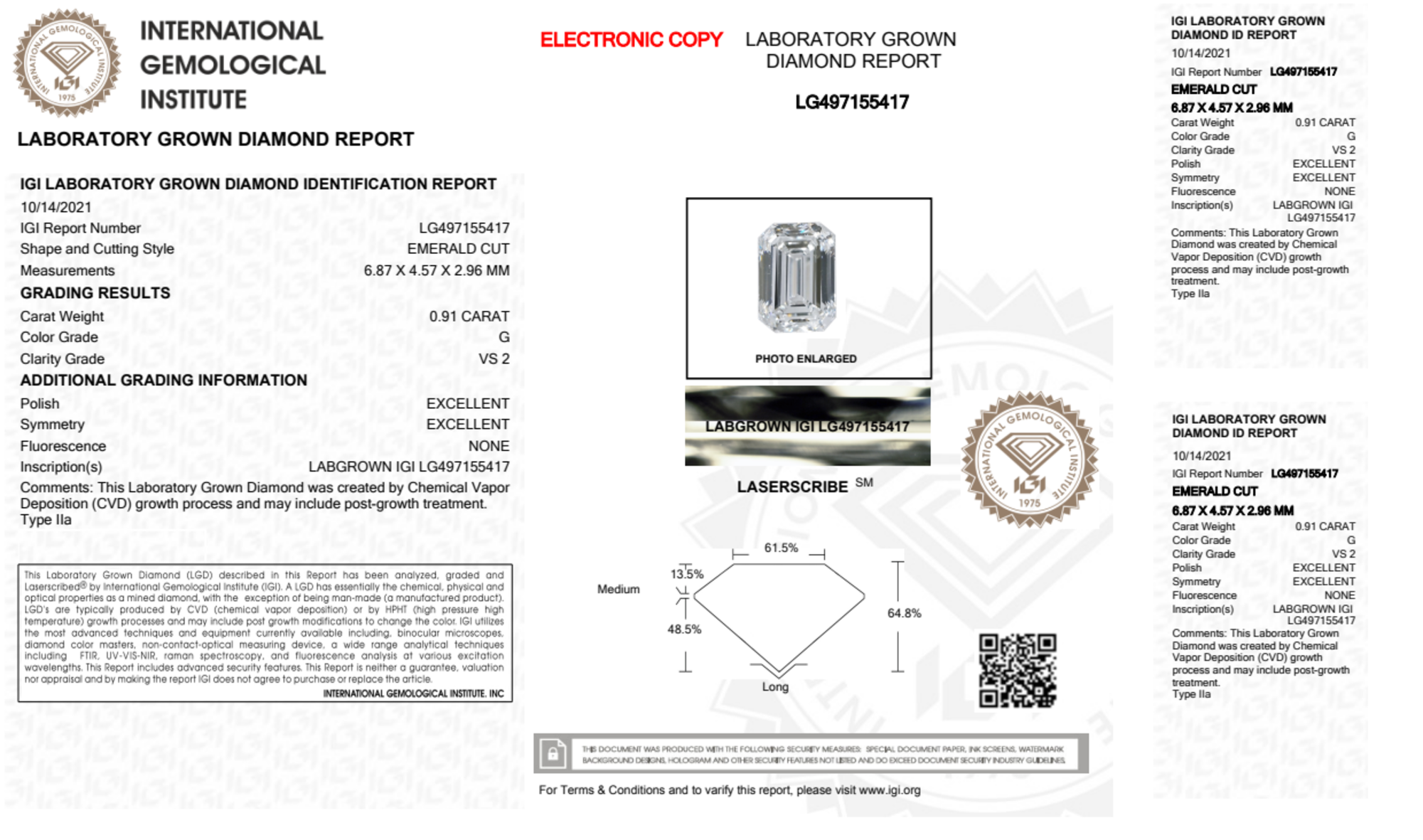 Your 0.91 carat Emerald lab diamond is graded VS2 clarity, which stands for Very Slightly Included 2. Read more about VS2 clarity diamonds here, or learn more about diamond clarity in general here.
