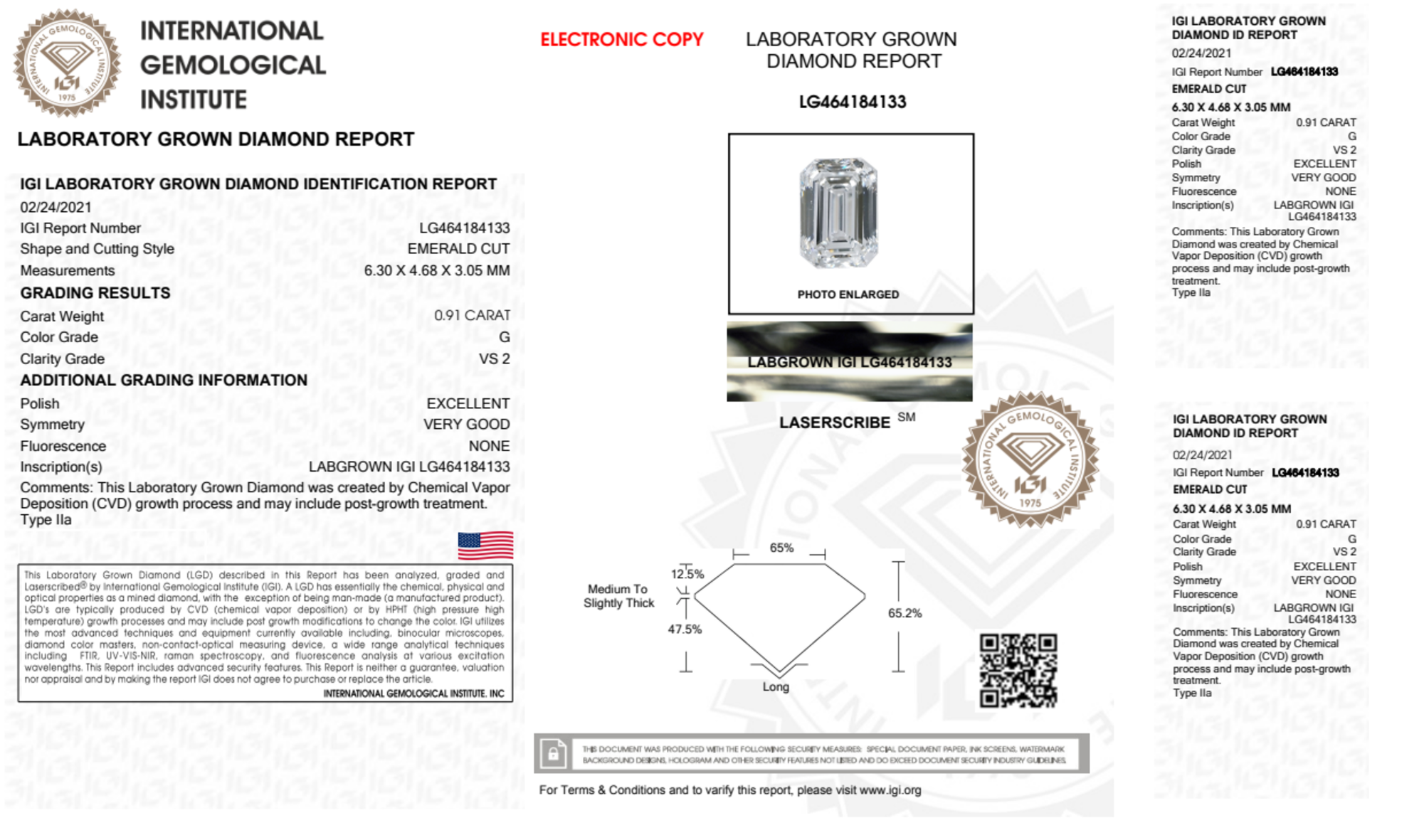 Your 0.91 carat Emerald lab diamond is graded VS2 clarity, which stands for Very Slightly Included 2. Read more about VS2 clarity diamonds here, or learn more about diamond clarity in general here.
