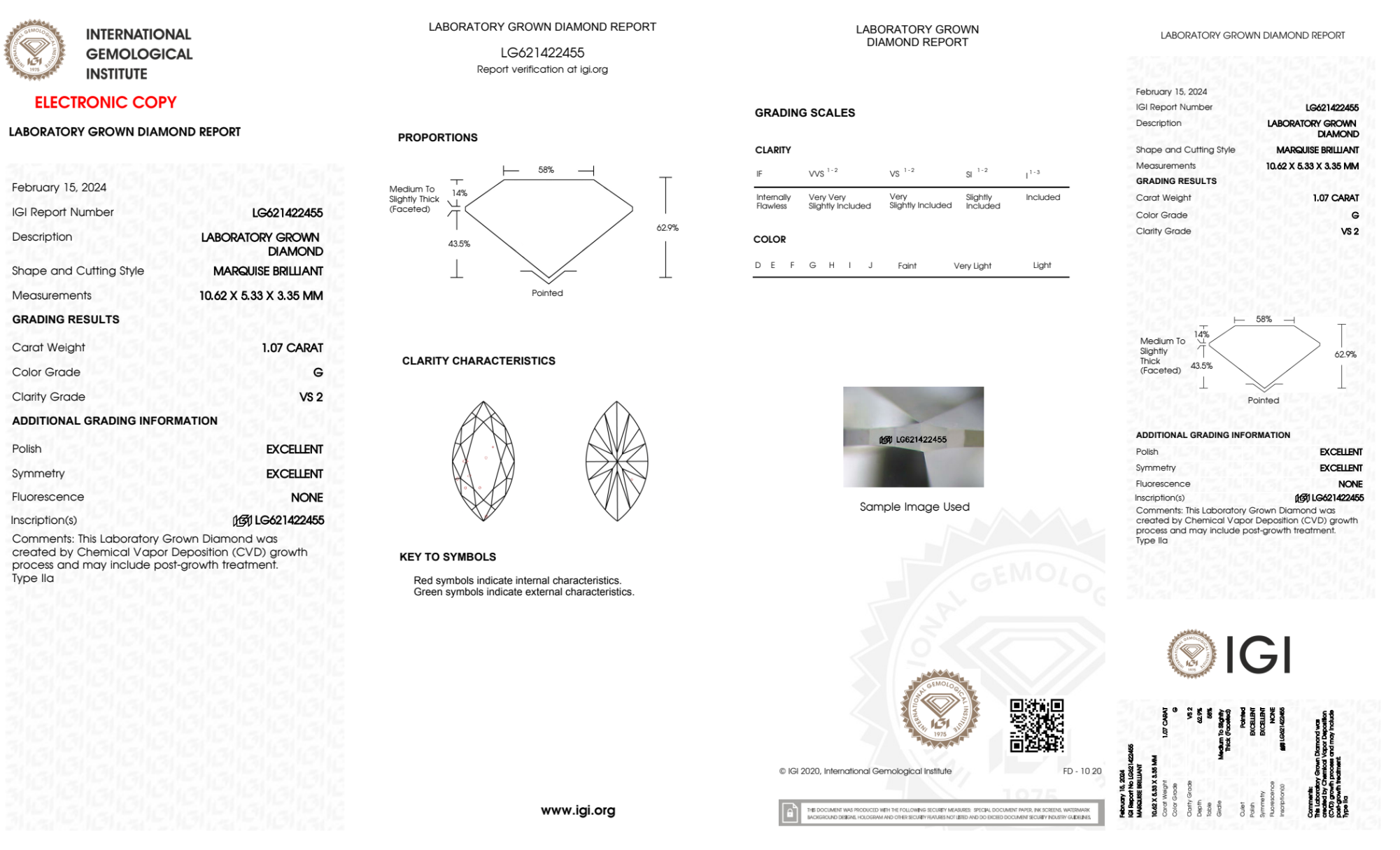Your 1.07 carat Marquise lab diamond is graded G color (Near Colorless), and you can read more about G color diamonds here.