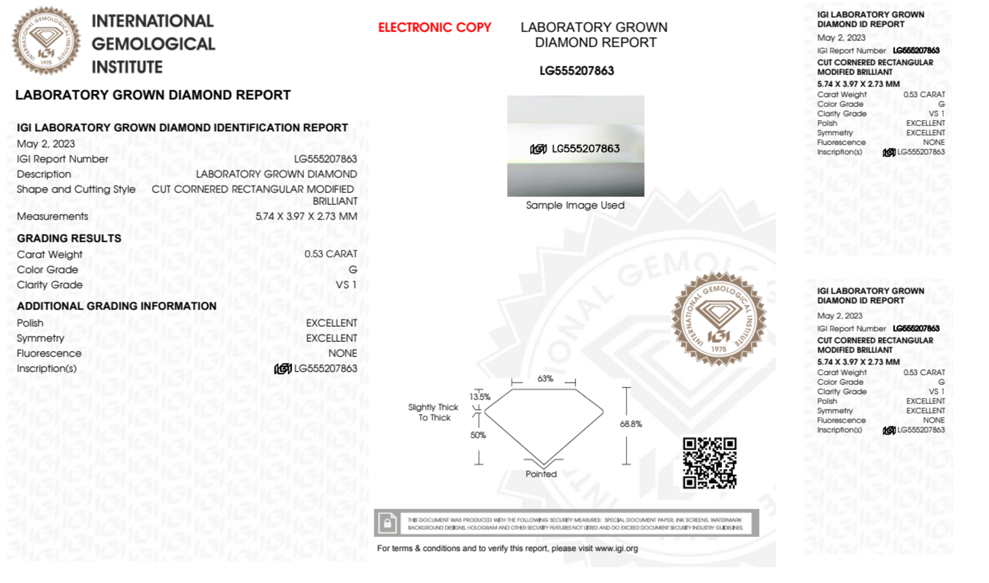 Your 0.53 carat Radiant lab diamond is graded G color (Near Colorless), and you can read more about G color diamonds here.