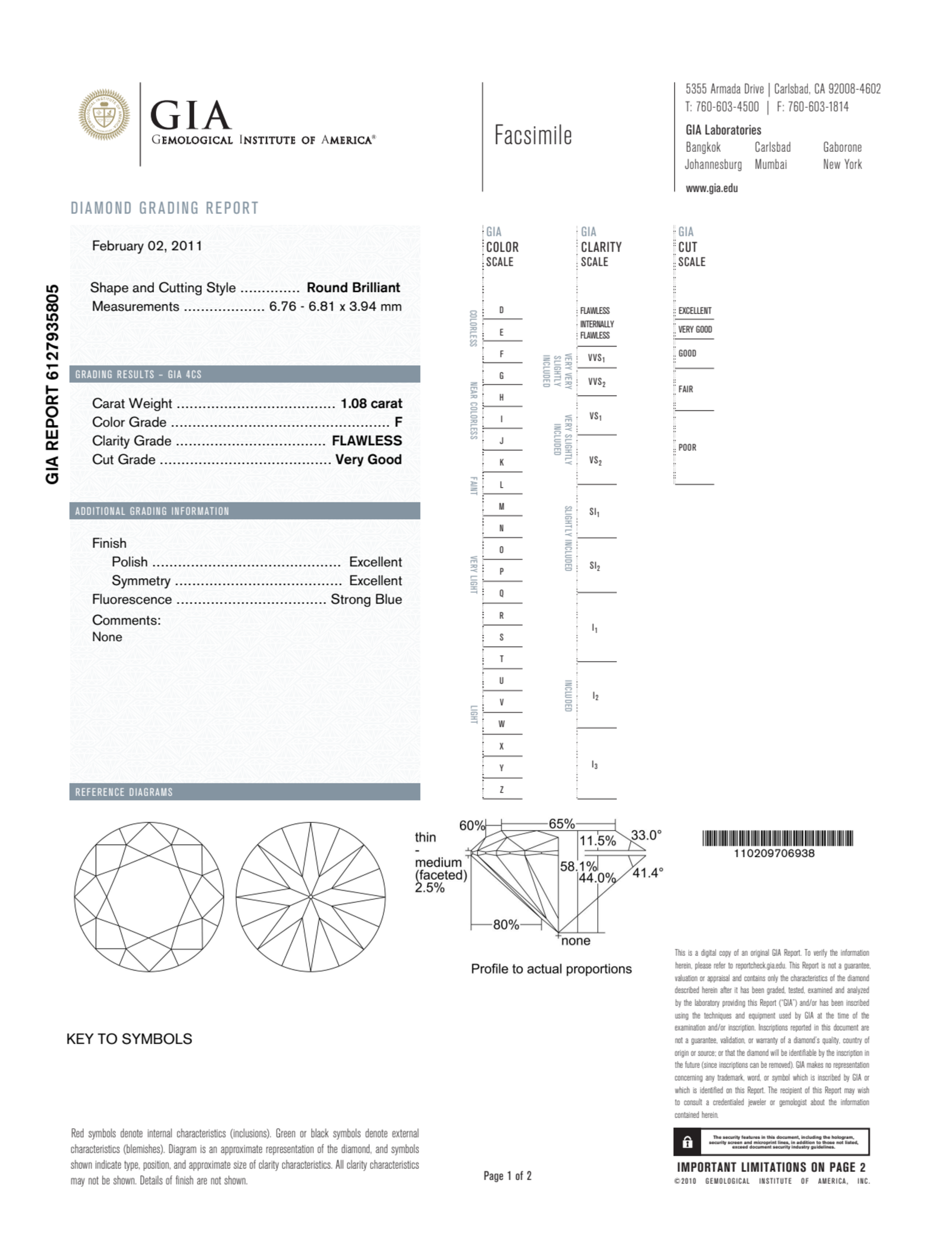 Your 1.08 carat Round natural diamond is graded F color (Colorless), and you can read more about F color diamonds here.