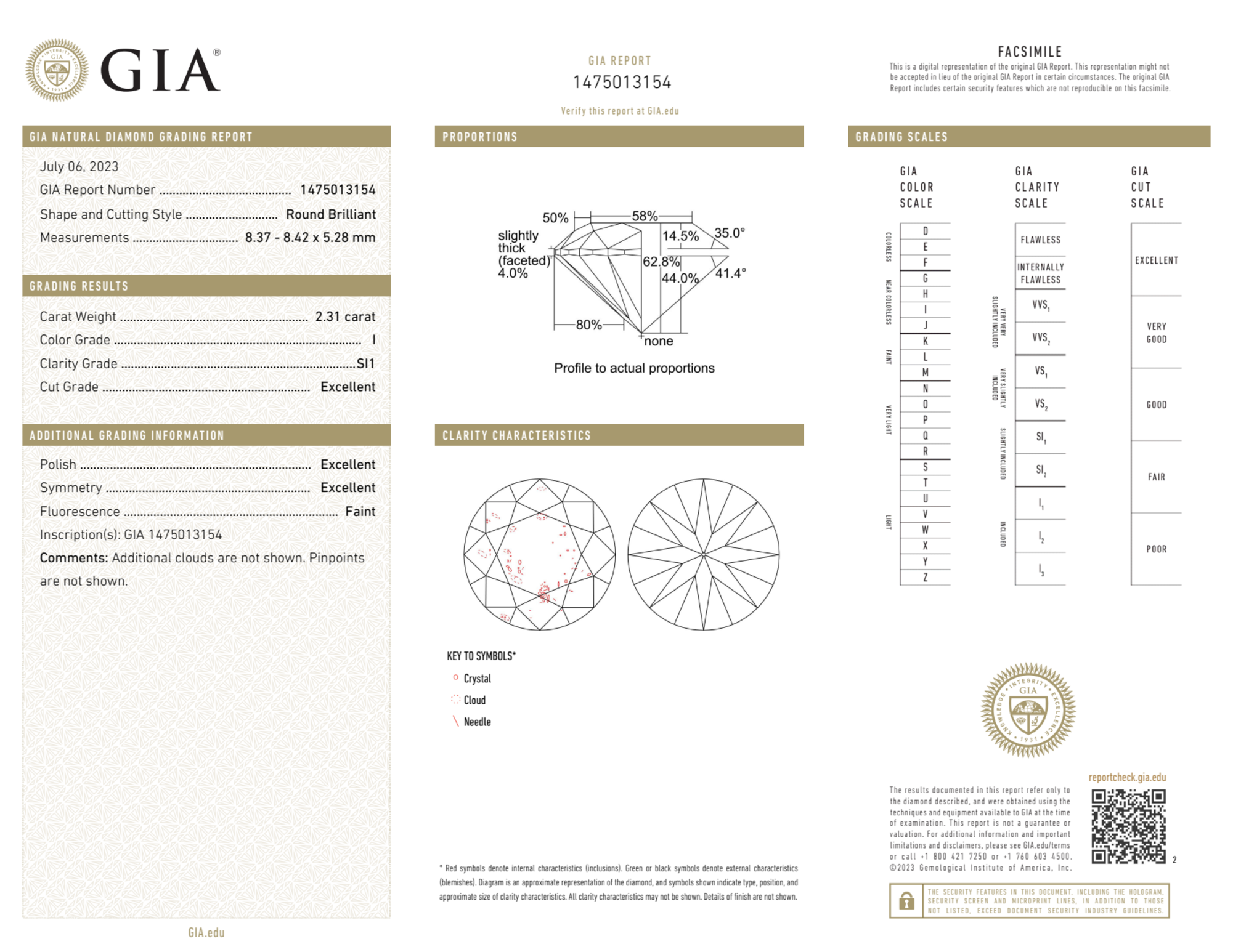 Your 2.31 carat Round natural diamond is graded SI1 clarity, which stands for Slightly Included 1. Read more about SI1 clarity diamonds here, or learn more about diamond clarity in general here.