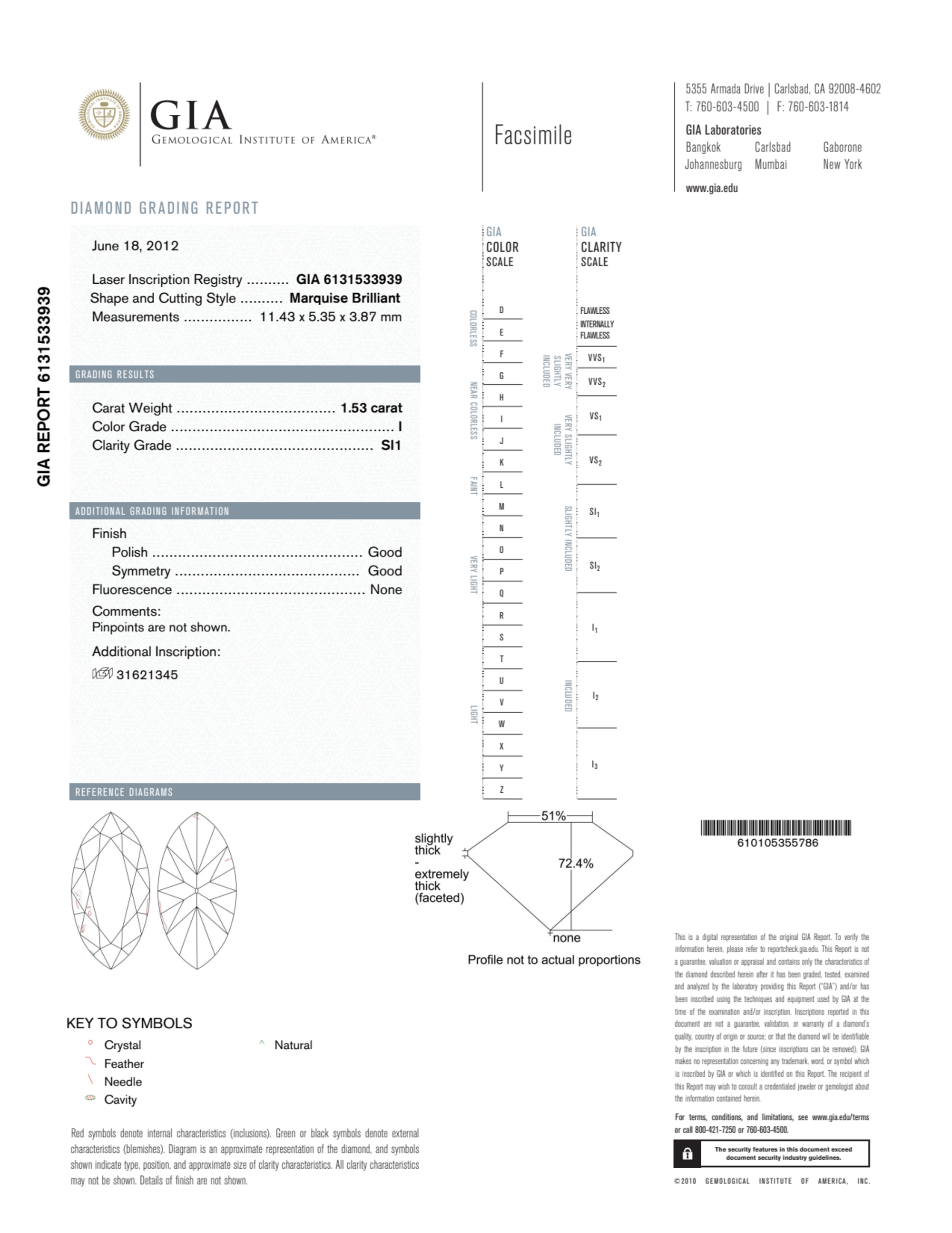 Your 1.53 carat Marquise natural diamond is graded SI1 clarity, which stands for Slightly Included 1. Read more about SI1 clarity diamonds here, or learn more about diamond clarity in general here.