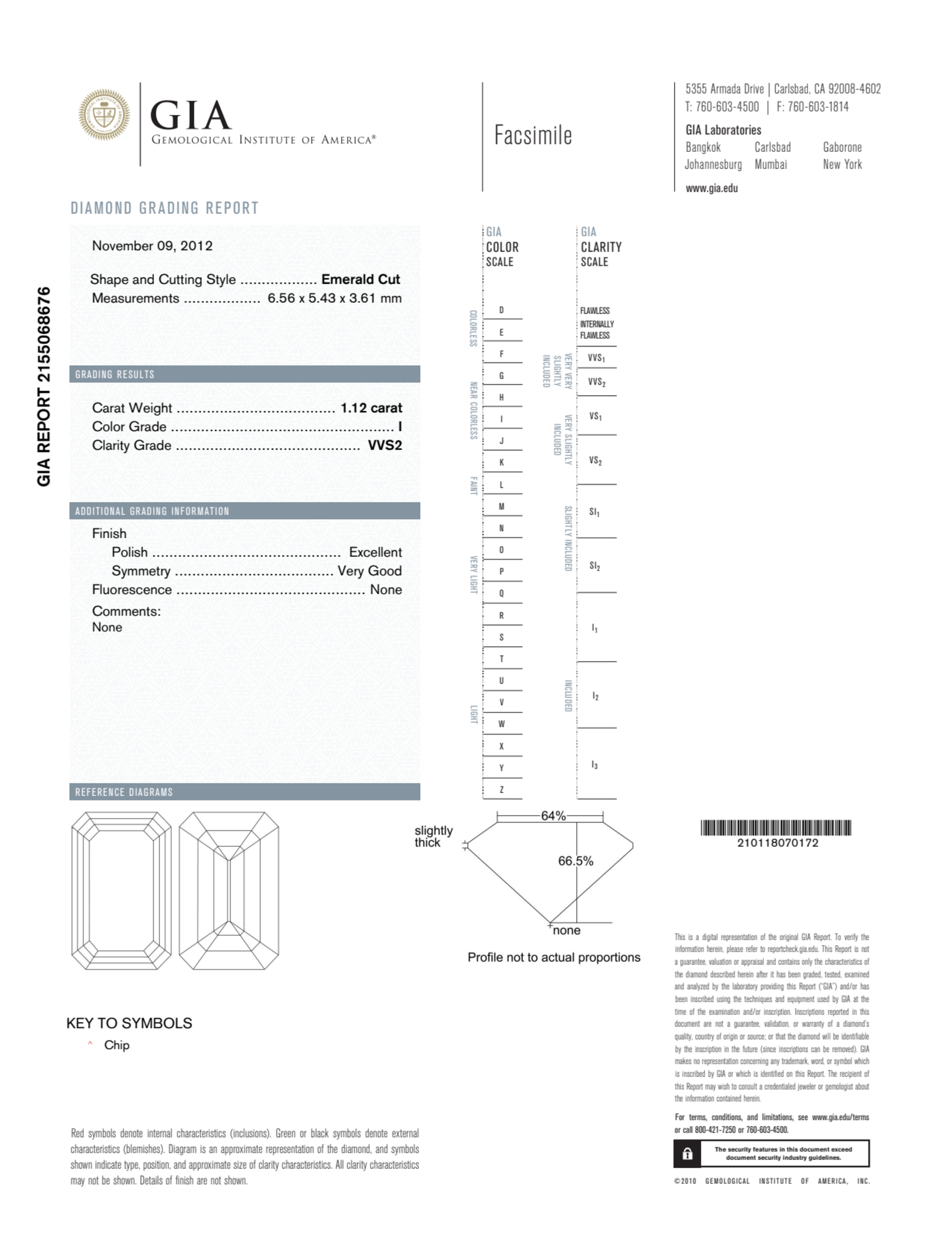 Your 1.12 carat Emerald natural diamond is graded VVS2 clarity, which stands for Very Very Slightly Included 2. Read more about VVS2 clarity diamonds here, or learn more about diamond clarity in general here.