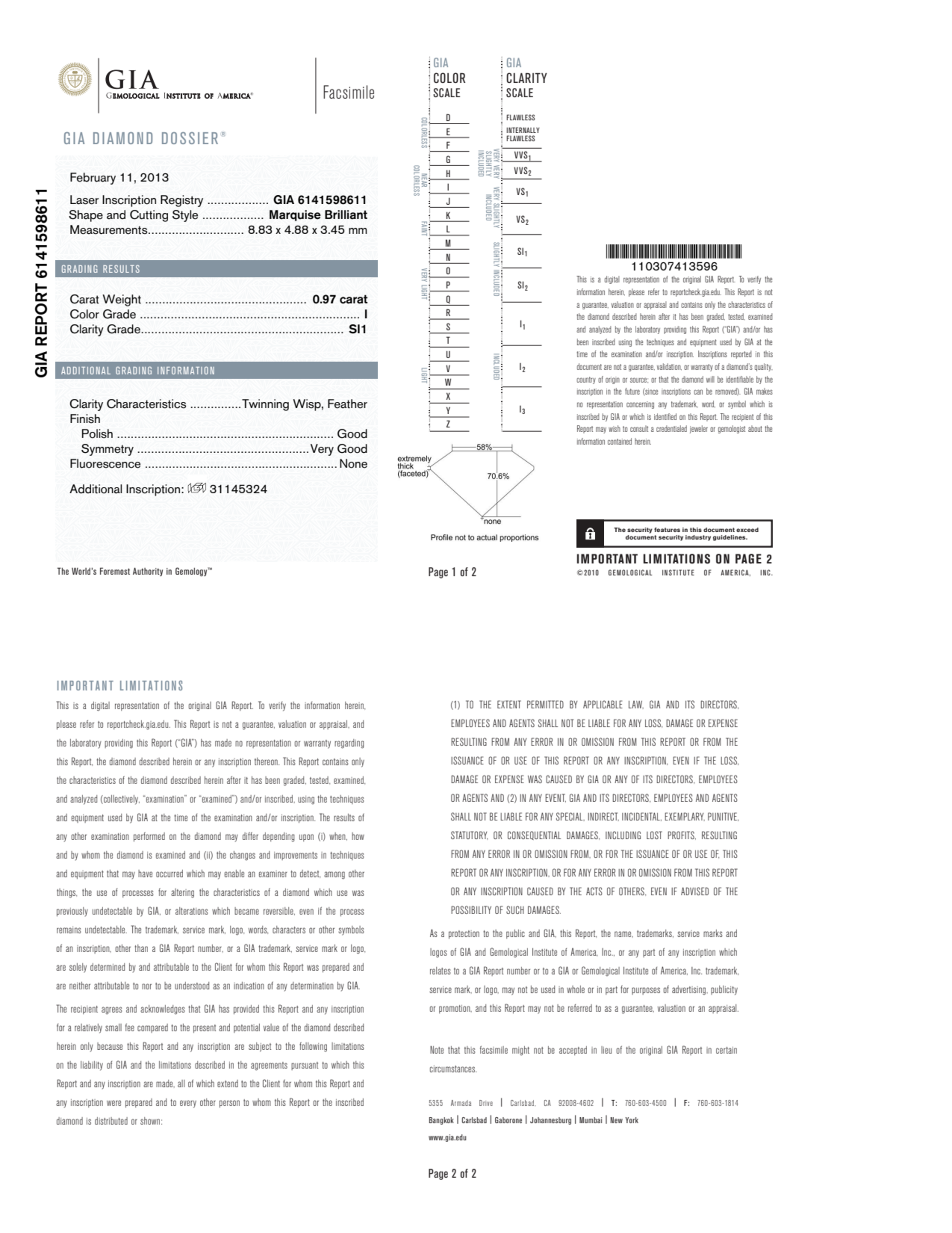 Your 0.97 carat Marquise natural diamond is graded SI1 clarity, which stands for Slightly Included 1. Read more about SI1 clarity diamonds here, or learn more about diamond clarity in general here.