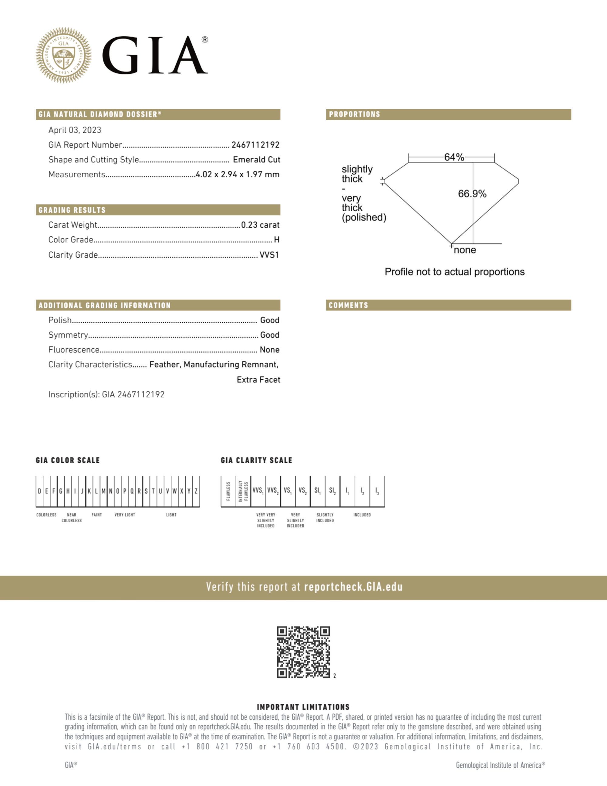 Your 0.23 carat Emerald natural diamond is graded VVS1 clarity, which stands for Very Very Slightly Included 1. Read more about VVS1 clarity diamonds here, or learn more about diamond clarity in general here.
