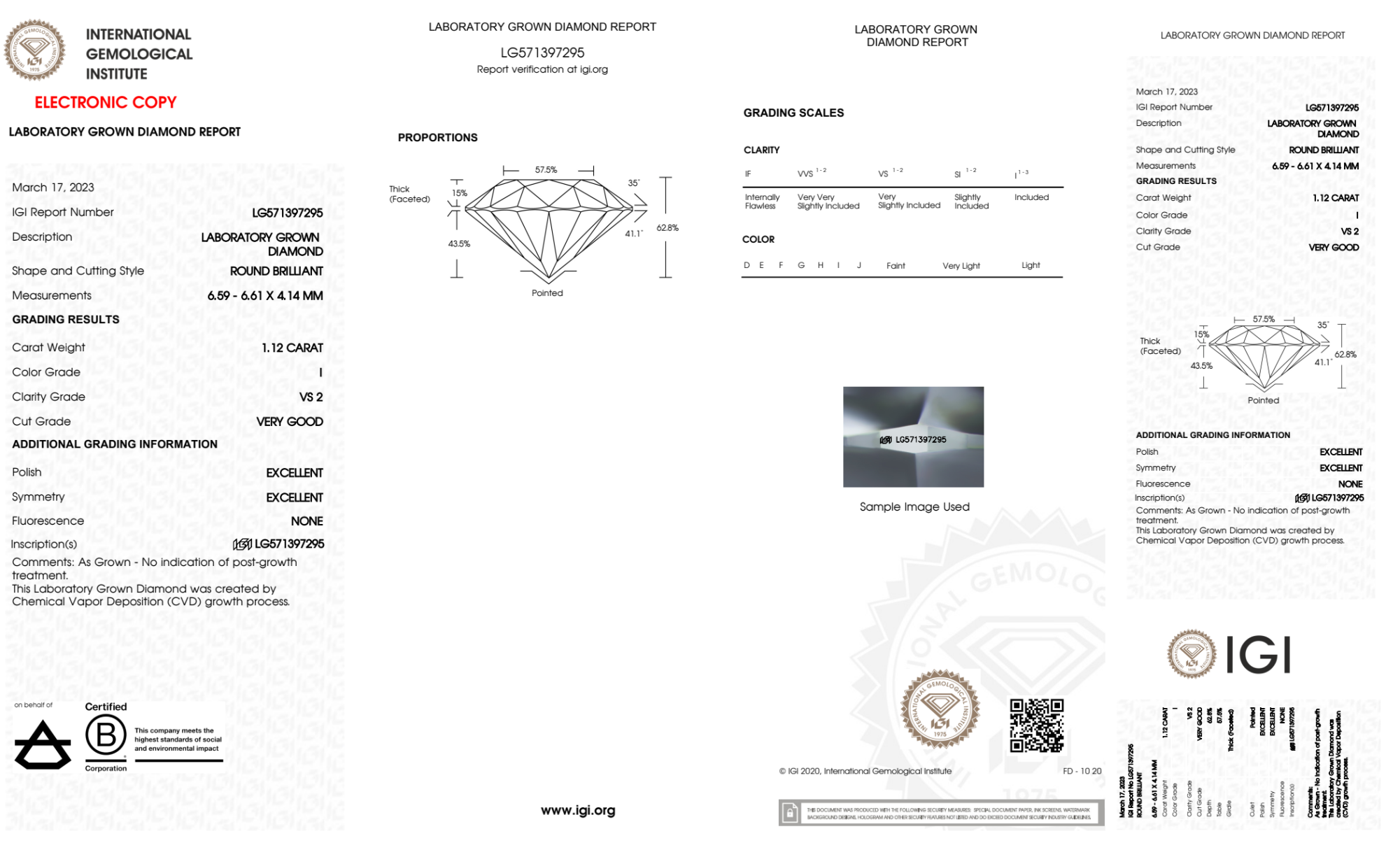Your 1.12 carat Round lab diamond is graded I color (Near Colorless), and you can read more about I color diamonds here.