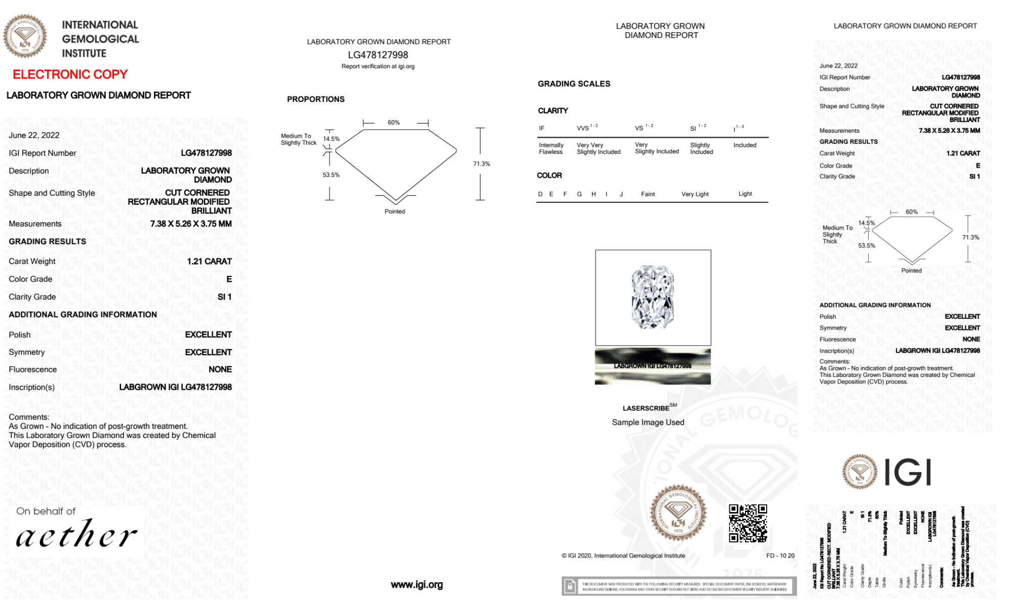 Your 1.21 carat Radiant lab diamond is graded E color (Colorless), and you can read more about E color diamonds here.