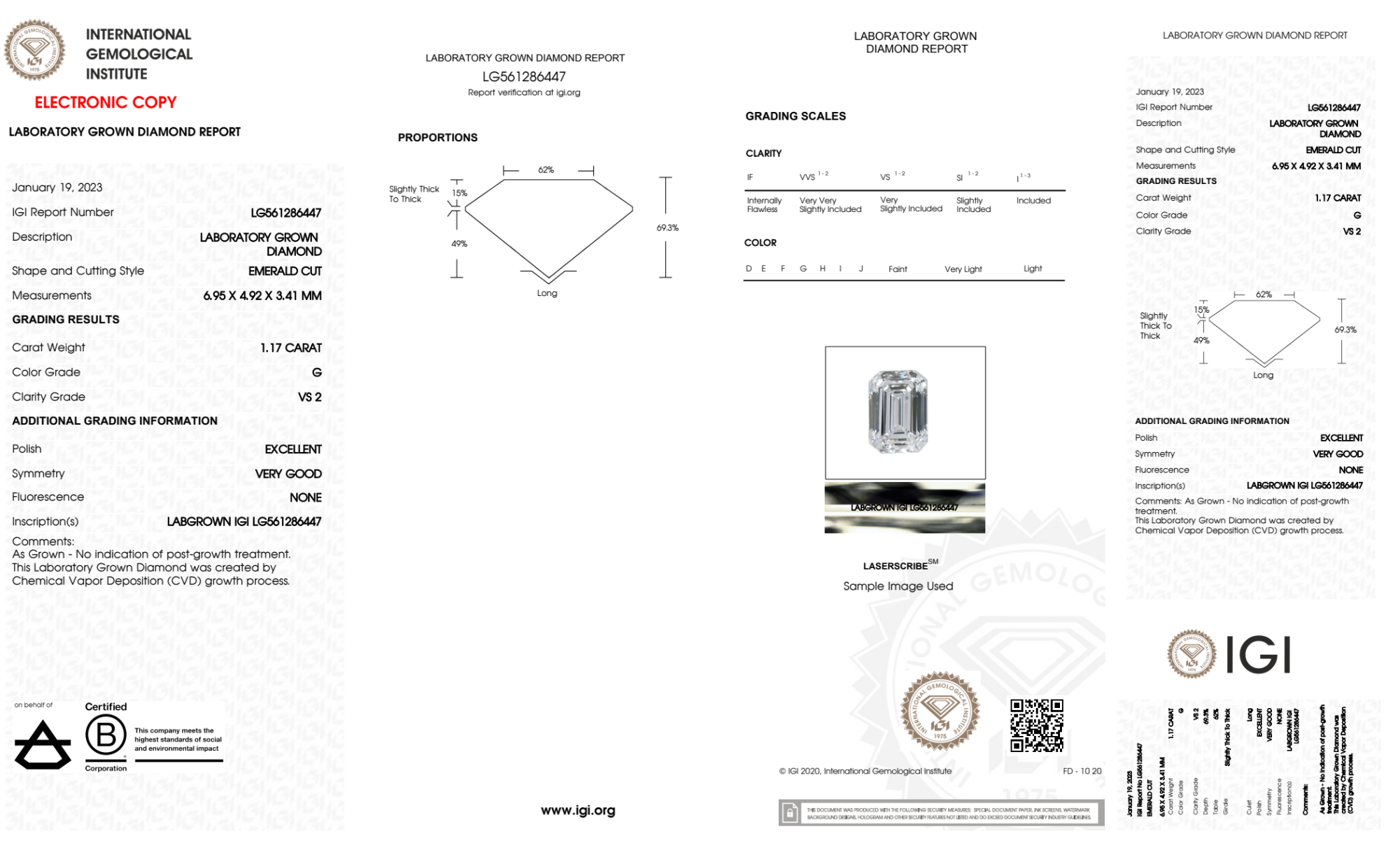 Your 1.17 carat Emerald lab diamond is graded G color (Near Colorless), and you can read more about G color diamonds here.