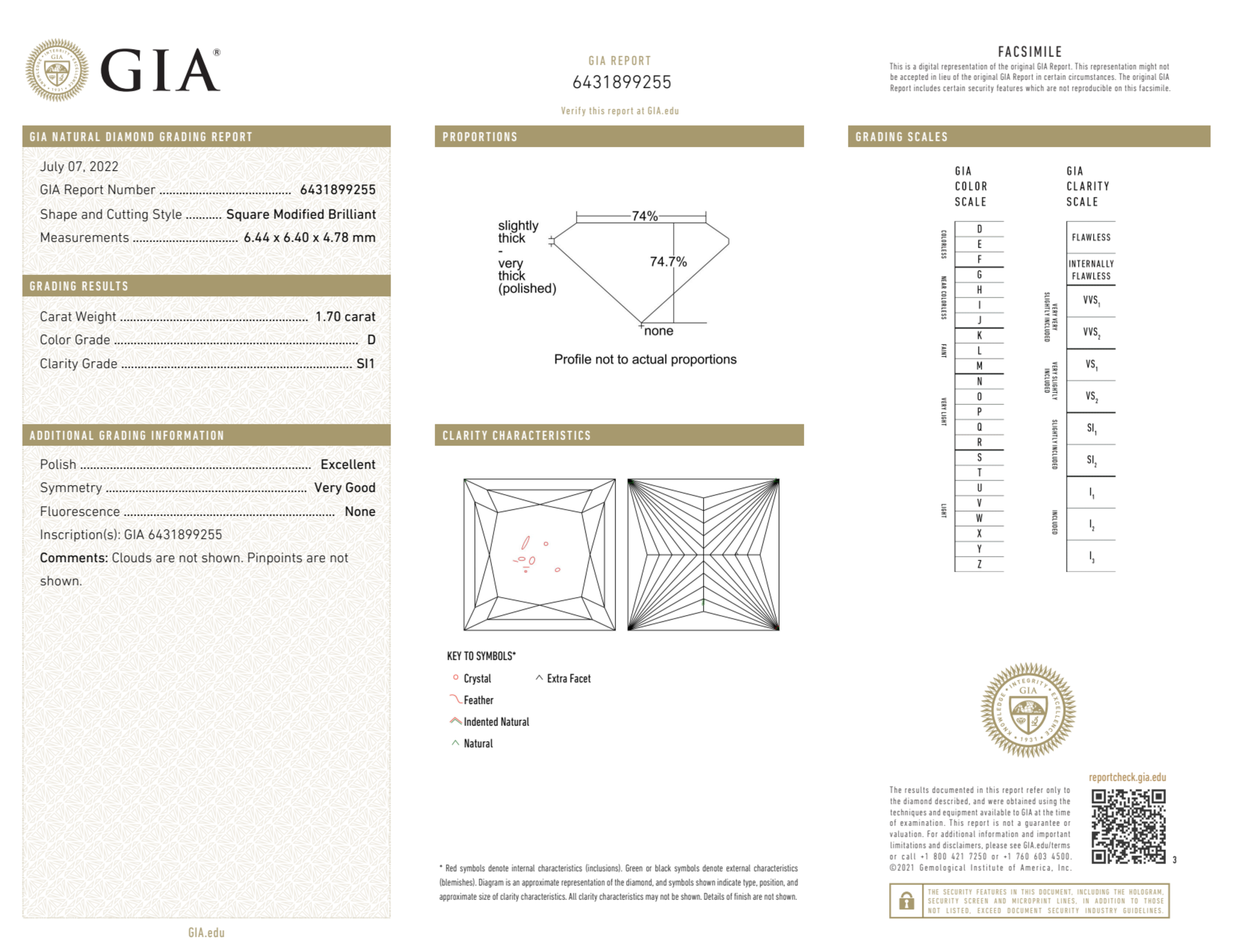 Your 1.70 carat Princess natural diamond is graded SI1 clarity, which stands for Slightly Included 1. Read more about SI1 clarity diamonds here, or learn more about diamond clarity in general here.