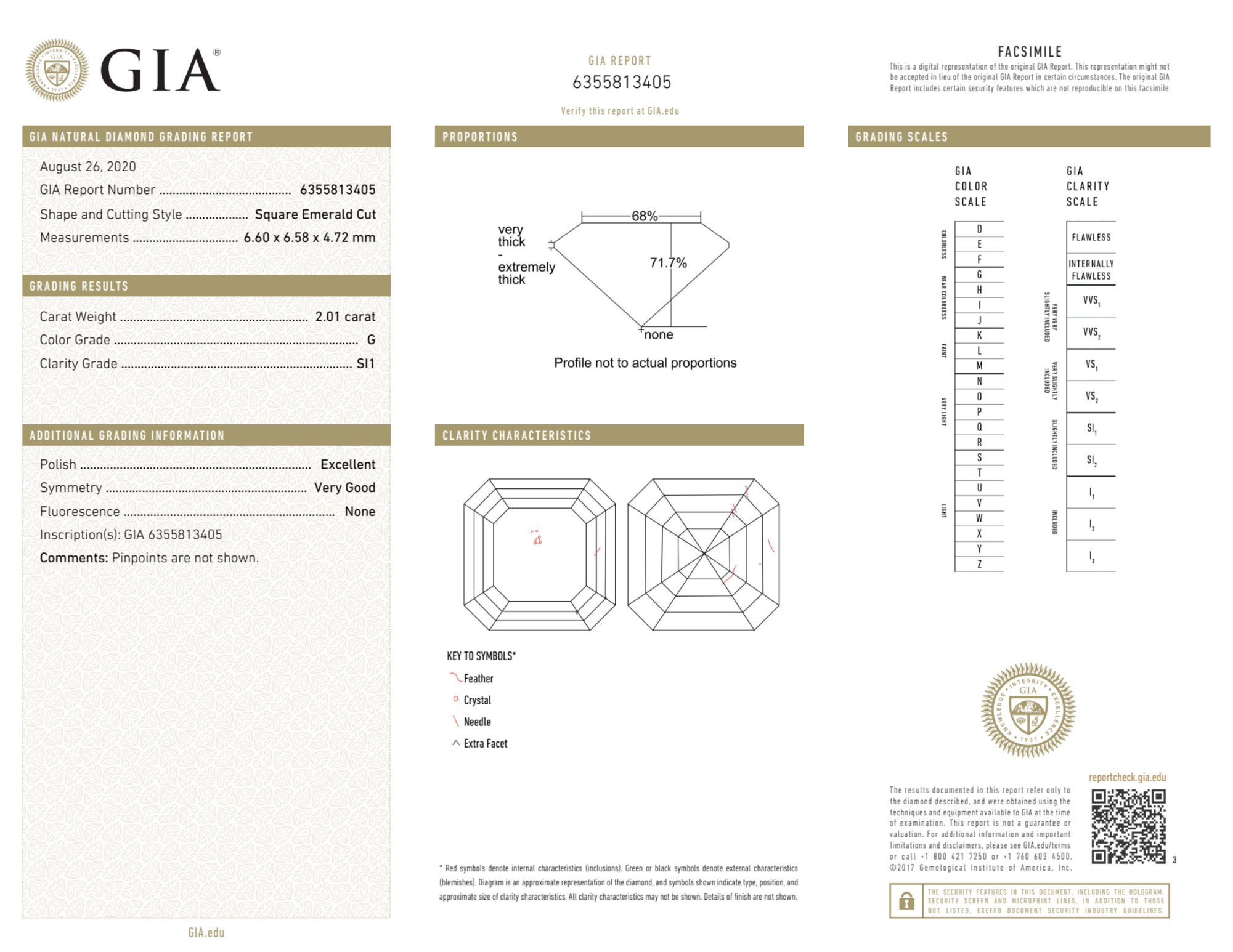 Your 2.01 carat Asscher natural diamond is graded SI1 clarity, which stands for Slightly Included 1. Read more about SI1 clarity diamonds here, or learn more about diamond clarity in general here.