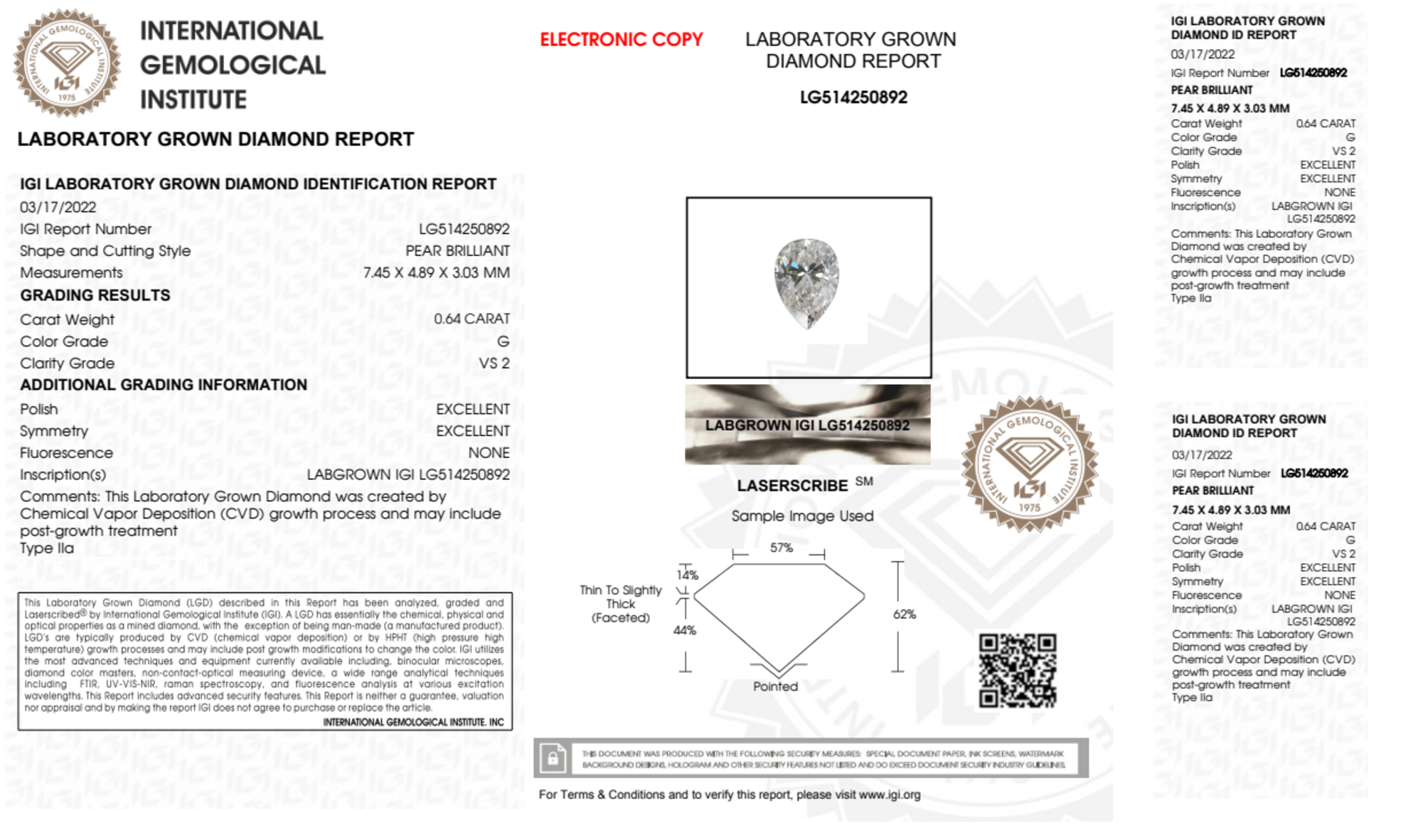 Your 0.64 carat Pear lab diamond is graded G color (Near Colorless), and you can read more about G color diamonds here.