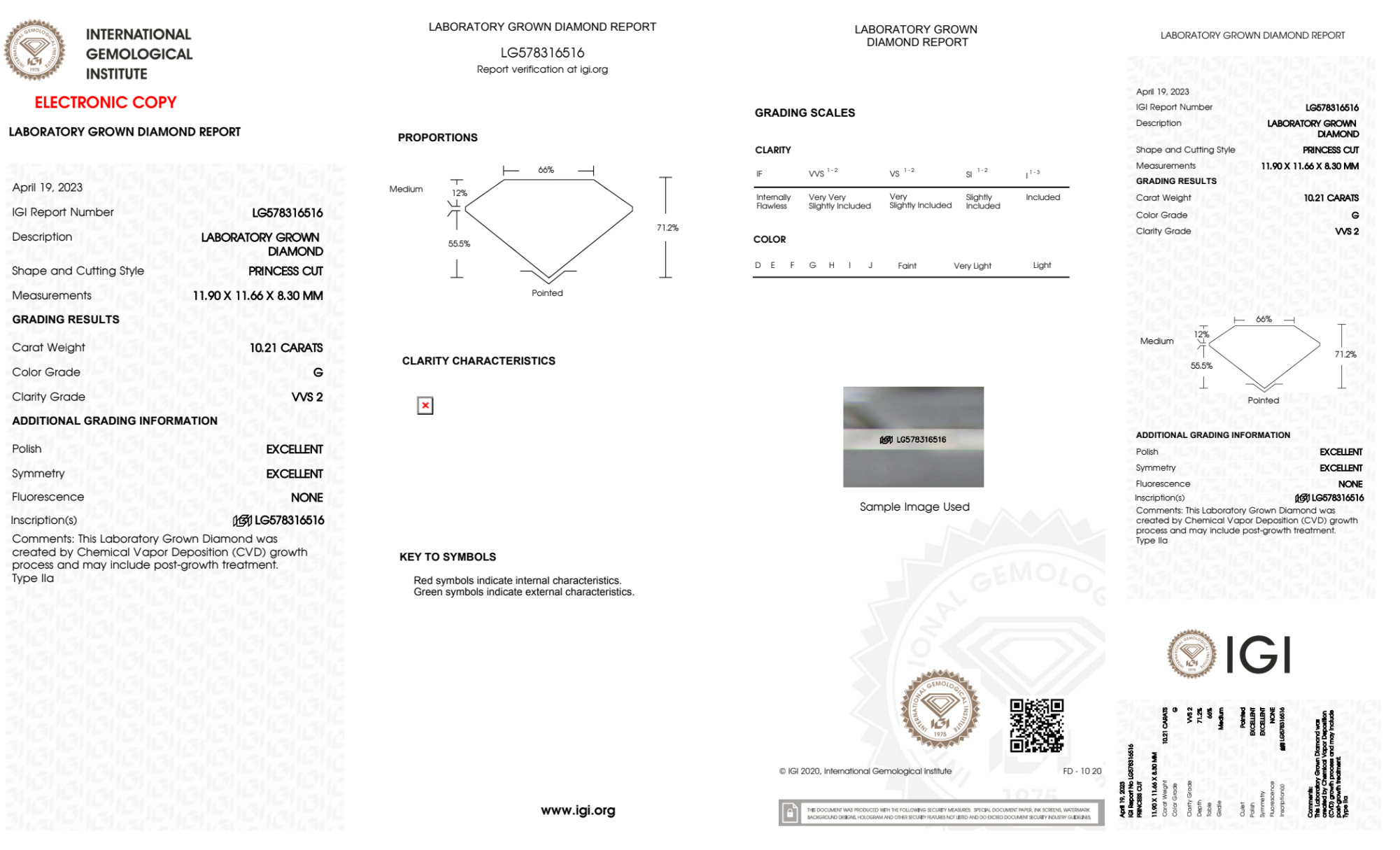 Your 10.21 carat Princess lab diamond is graded G color (Near Colorless), and you can read more about G color diamonds here.