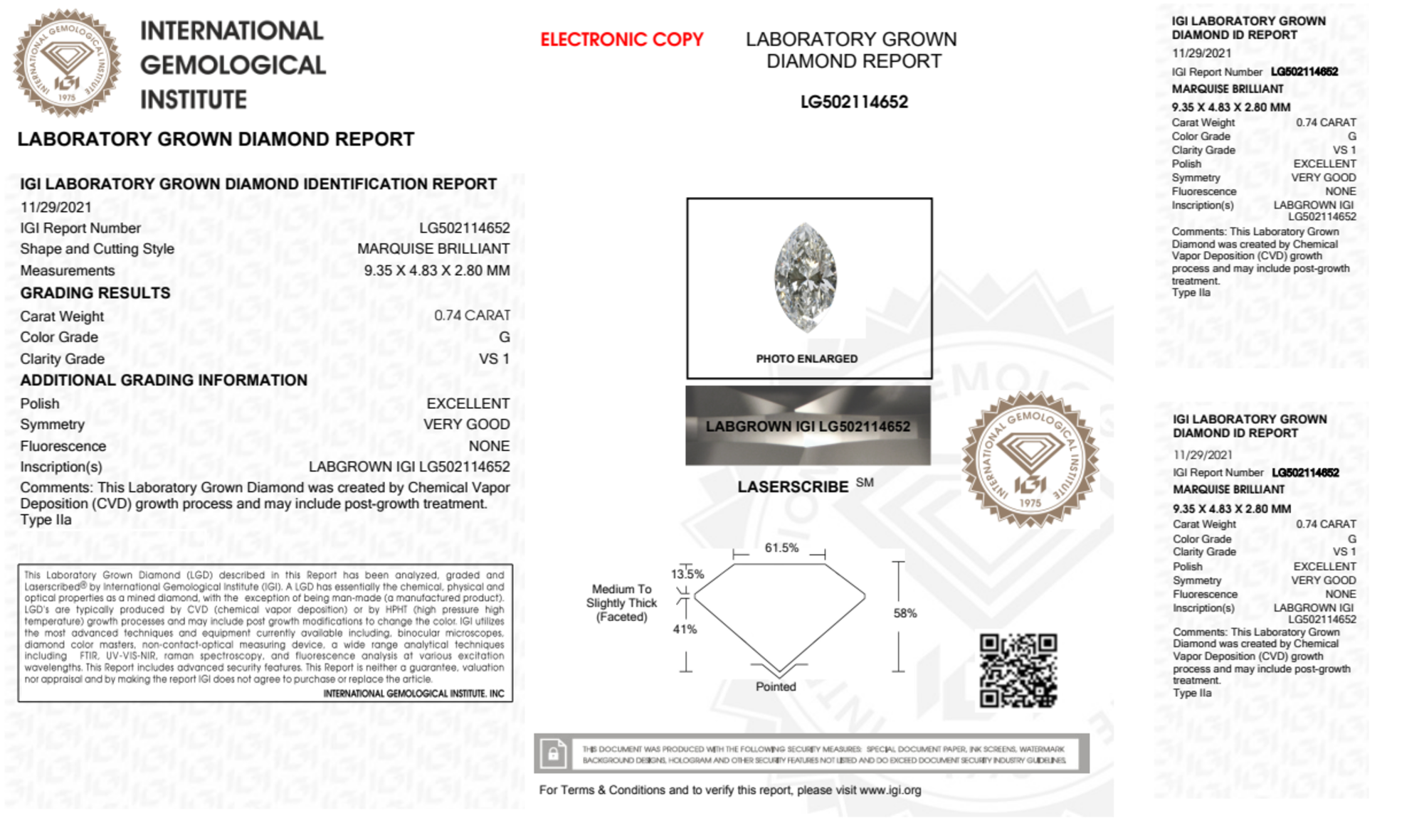 Your 0.74 carat Marquise lab diamond is graded G color (Near Colorless), and you can read more about G color diamonds here.