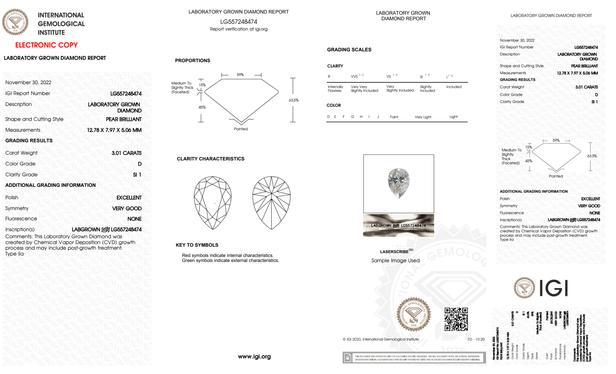 Your 3.01 carat Pear lab diamond is graded D color (Colorless), and you can read more about D color diamonds here.