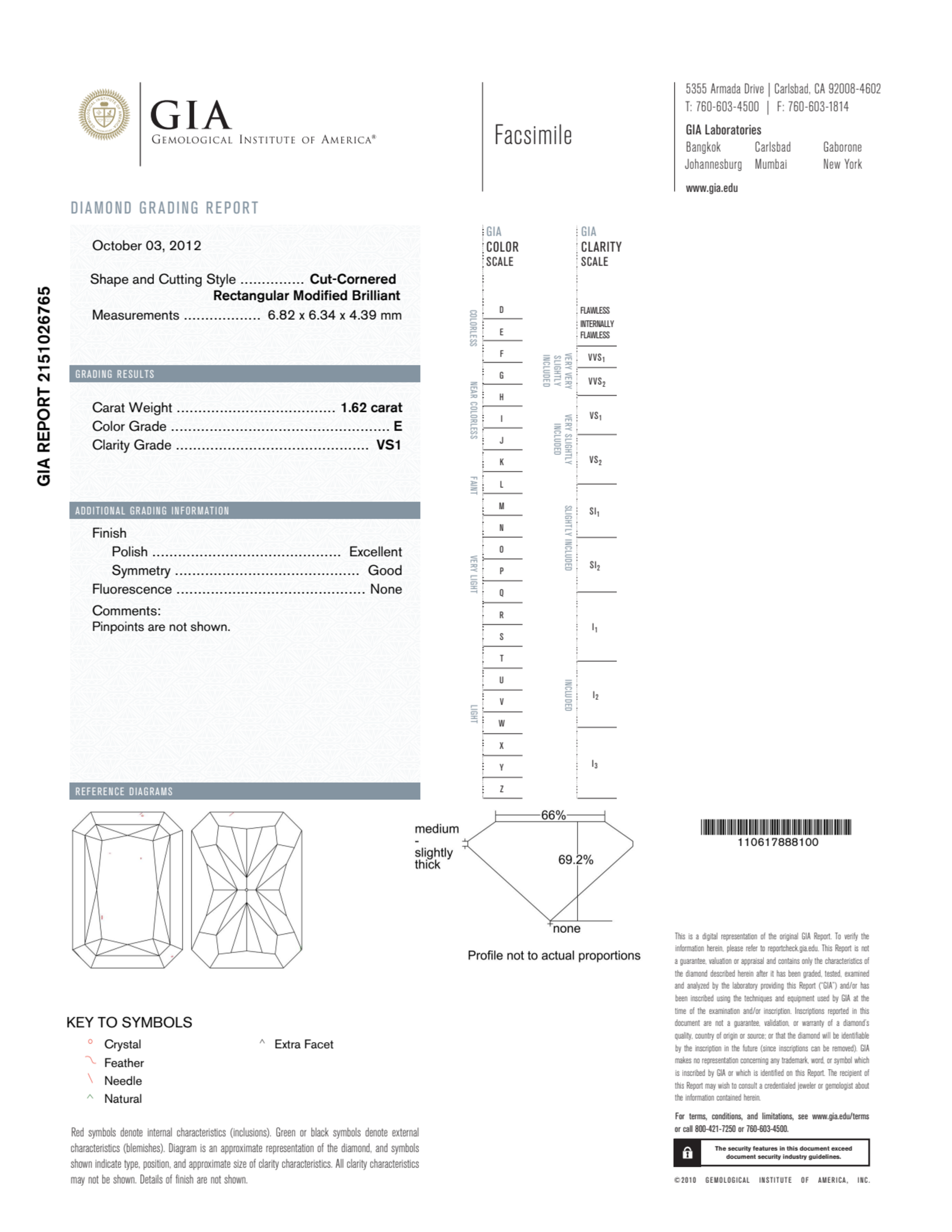 Your 1.62 carat Radiant natural diamond is graded E color (Colorless), and you can read more about E color diamonds here.