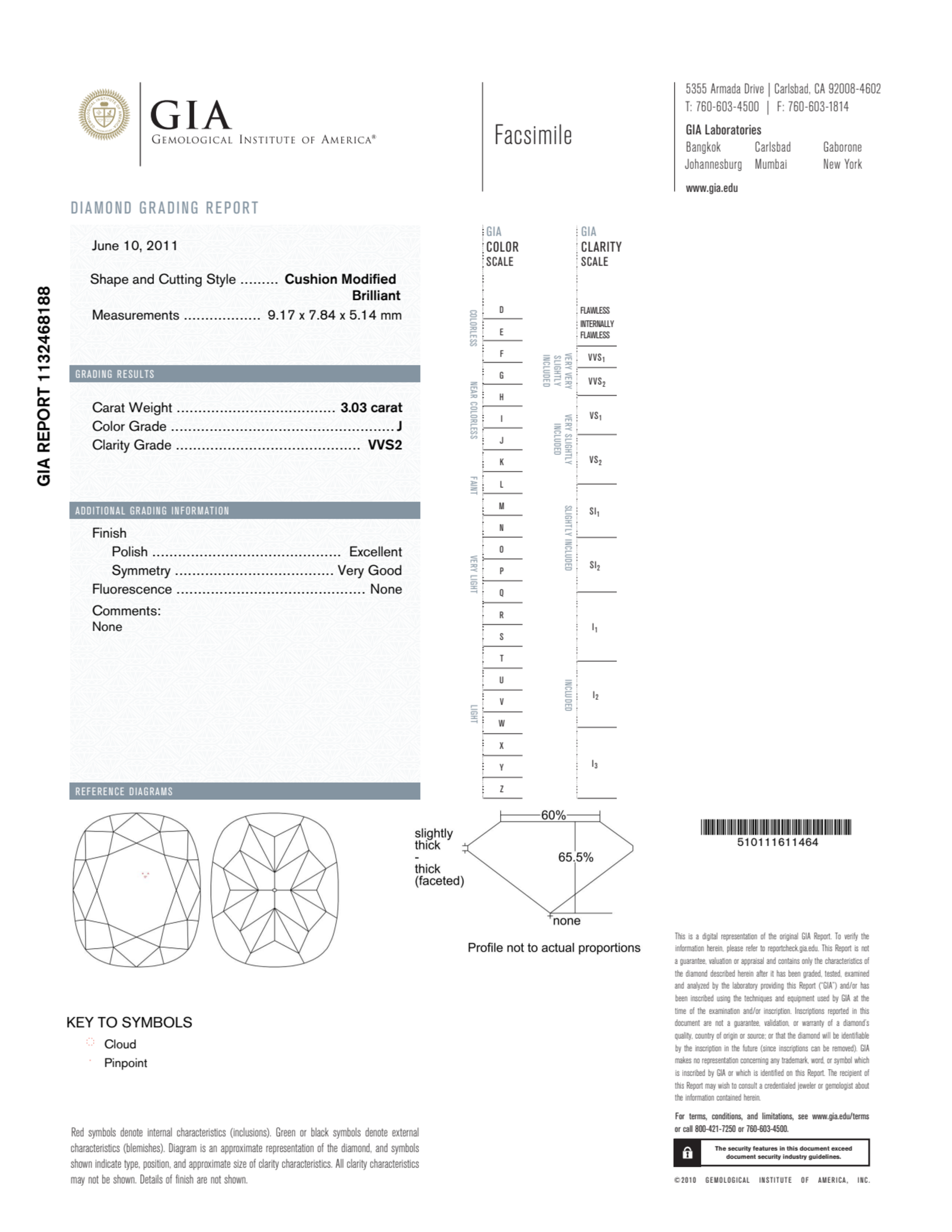 Your 3.03 carat Cushion natural diamond is graded J color (Near Colorless), and you can read more about J color diamonds here.