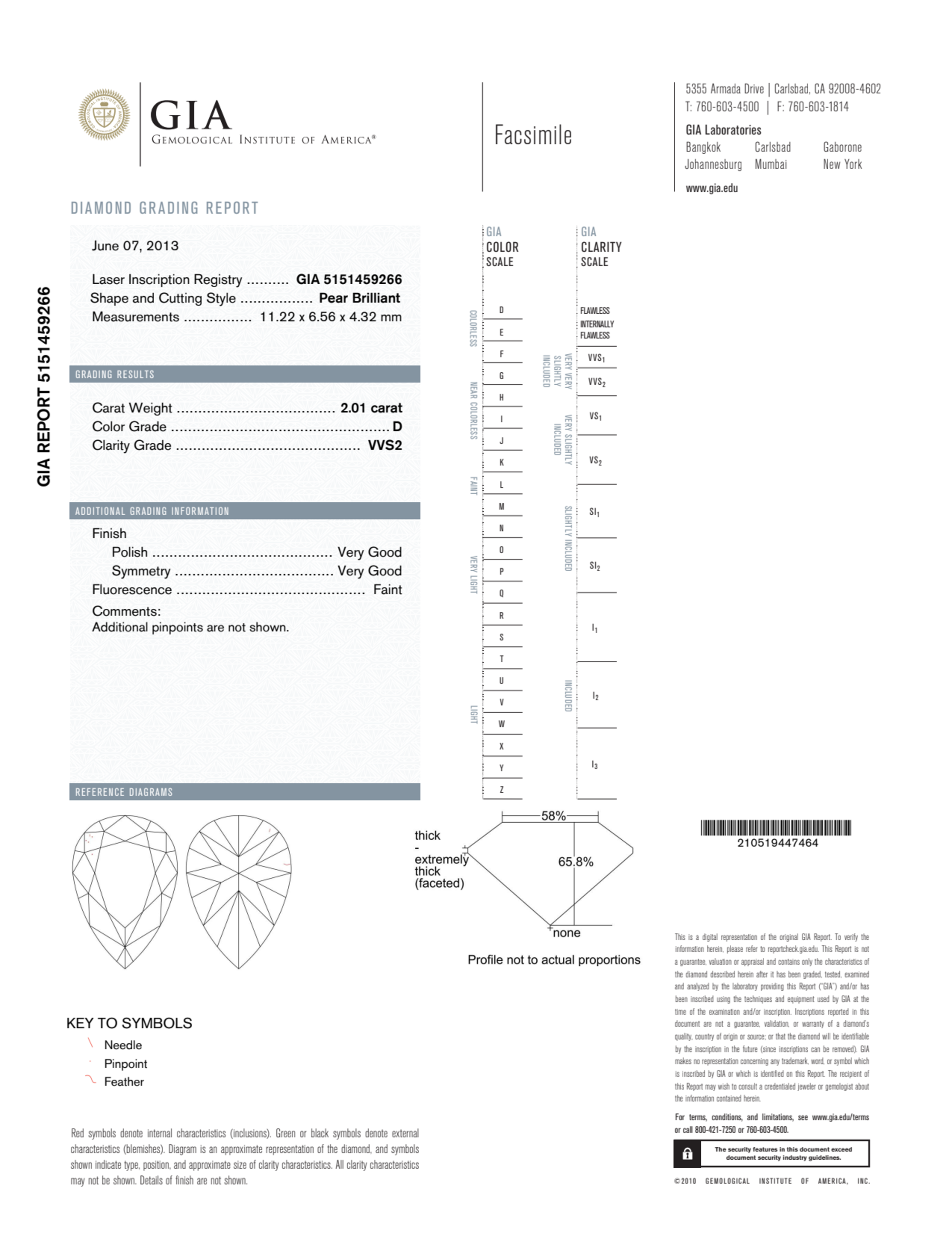 Your 2.01 carat Pear natural diamond is graded D color (Colorless), and you can read more about D color diamonds here.