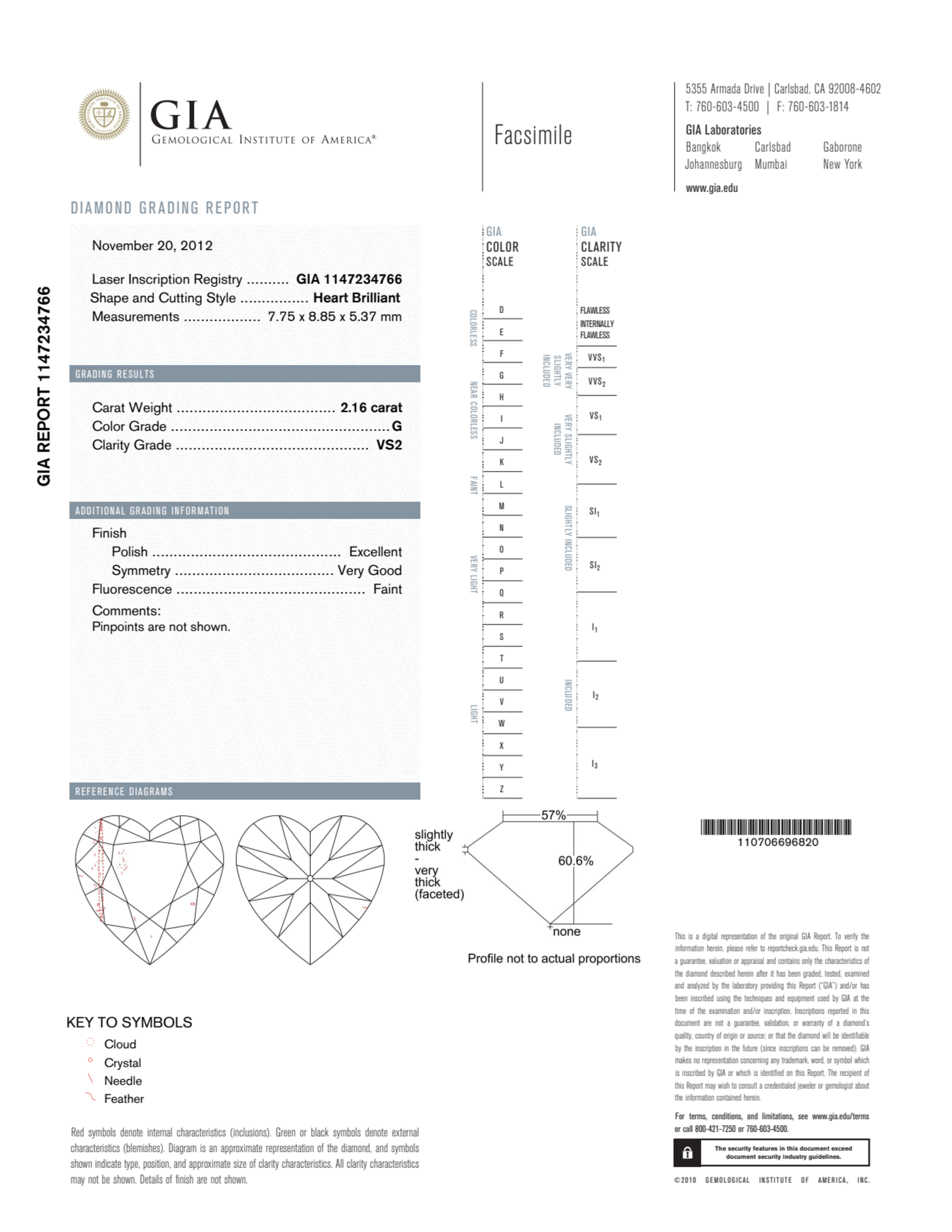 Your 2.16 carat Heart natural diamond is graded VS2 clarity, which stands for Very Slightly Included 2. Read more about VS2 clarity diamonds here, or learn more about diamond clarity in general here.
