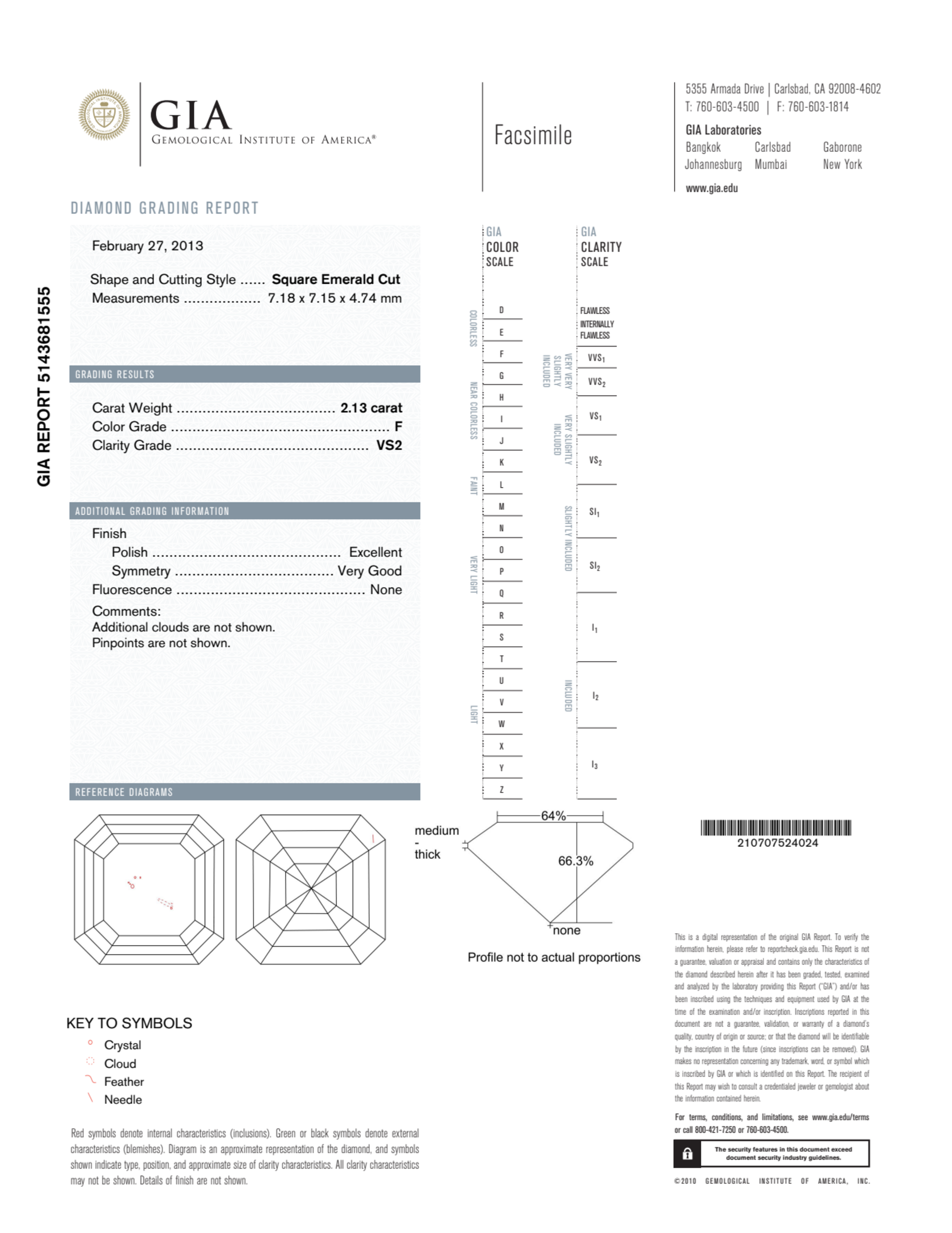 Your 2.13 carat Asscher natural diamond is graded VS2 clarity, which stands for Very Slightly Included 2. Read more about VS2 clarity diamonds here, or learn more about diamond clarity in general here.