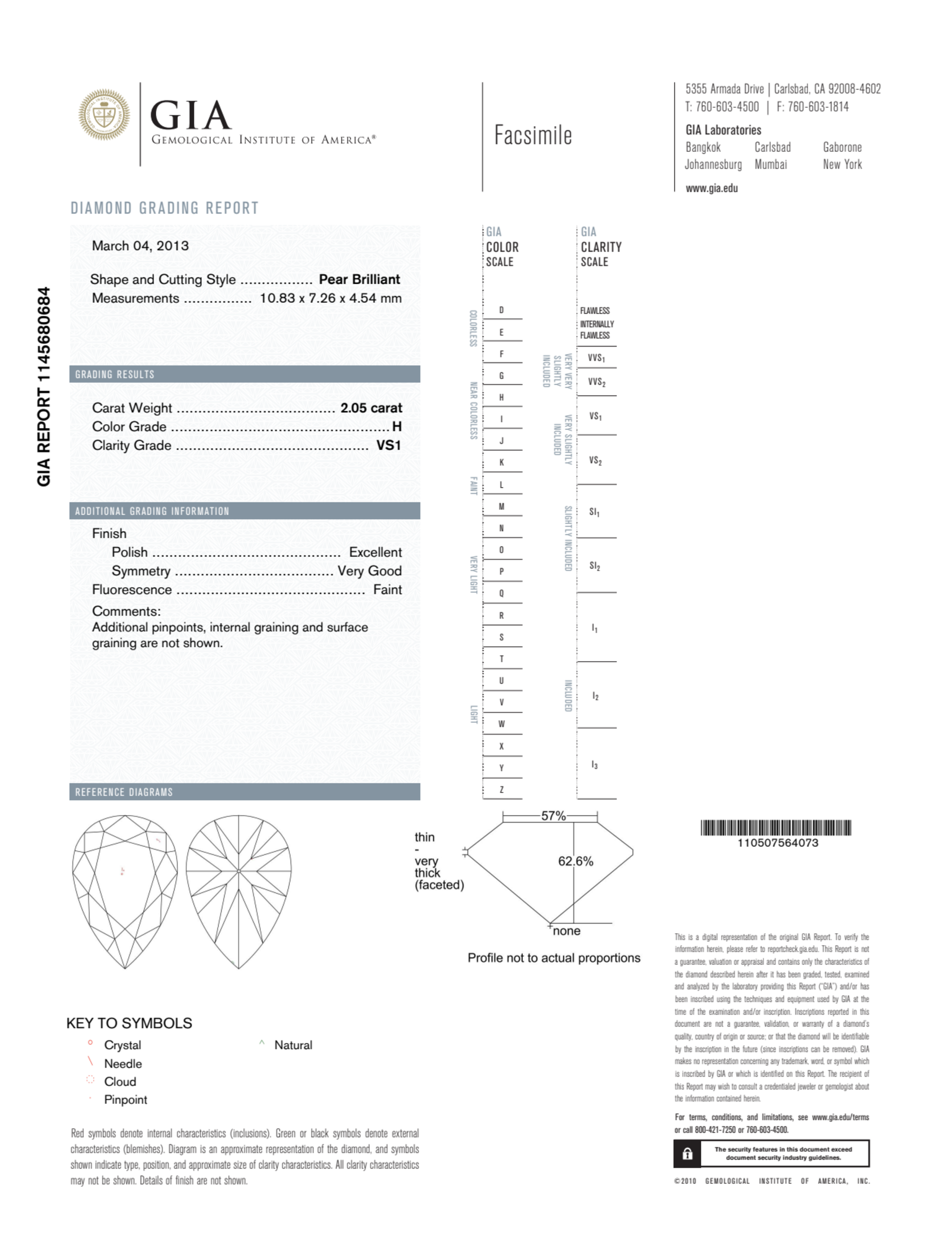 Your 2.05 carat Pear natural diamond is graded VS1 clarity, which stands for Very Slightly Included 1. Read more about VS1 clarity diamonds here, or learn more about diamond clarity in general here.