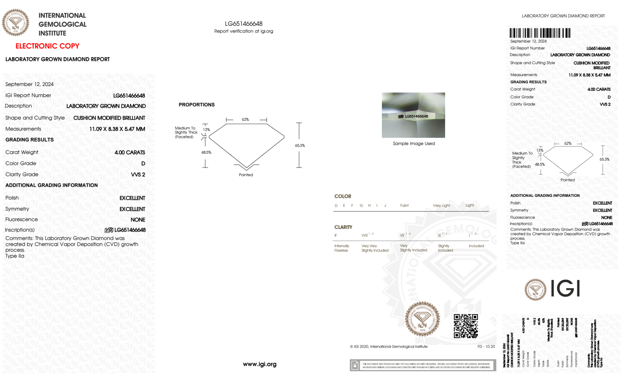 Your 4.00 carat Cushion lab diamond is graded D color (Colorless), and you can read more about D color diamonds here.