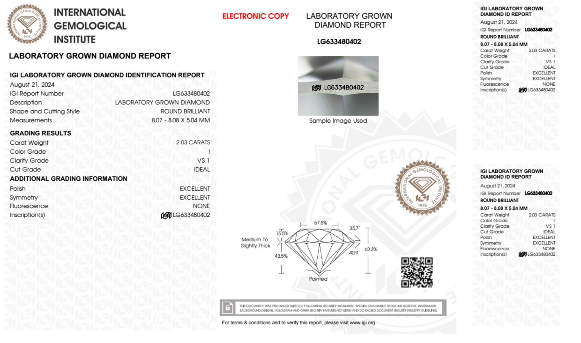 Your 2.03 carat Round lab diamond is graded VS1 clarity, which stands for Very Slightly Included 1. Read more about VS1 clarity diamonds here, or learn more about diamond clarity in general here.