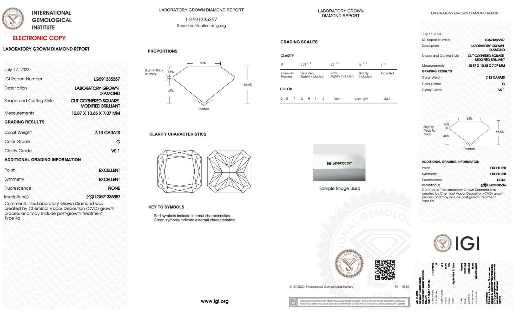 Your 7.13 carat Radiant lab diamond is graded G color (Near Colorless), and you can read more about G color diamonds here.