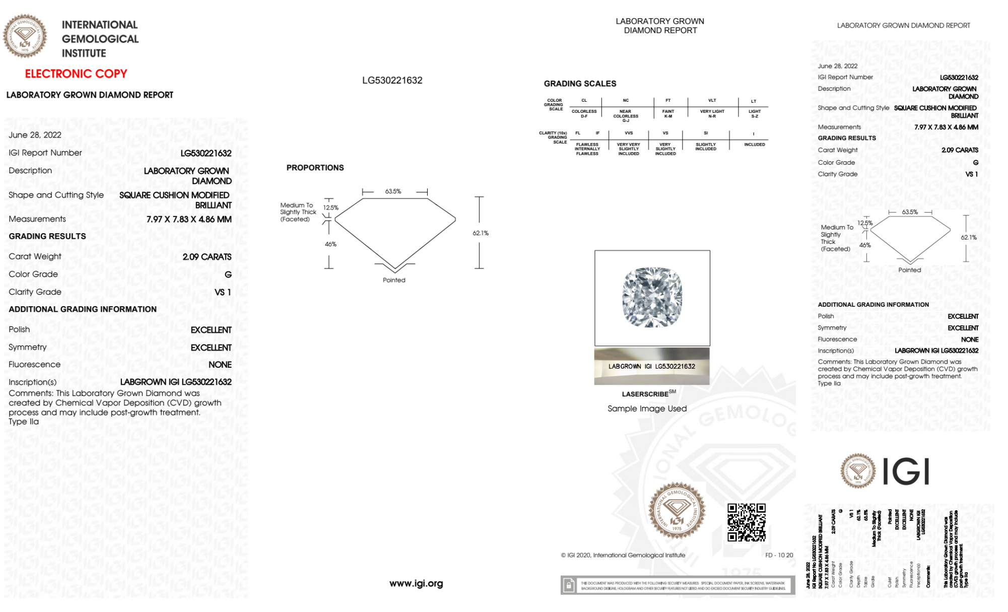 Your 2.09 carat Cushion lab diamond is graded G color (Near Colorless), and you can read more about G color diamonds here.