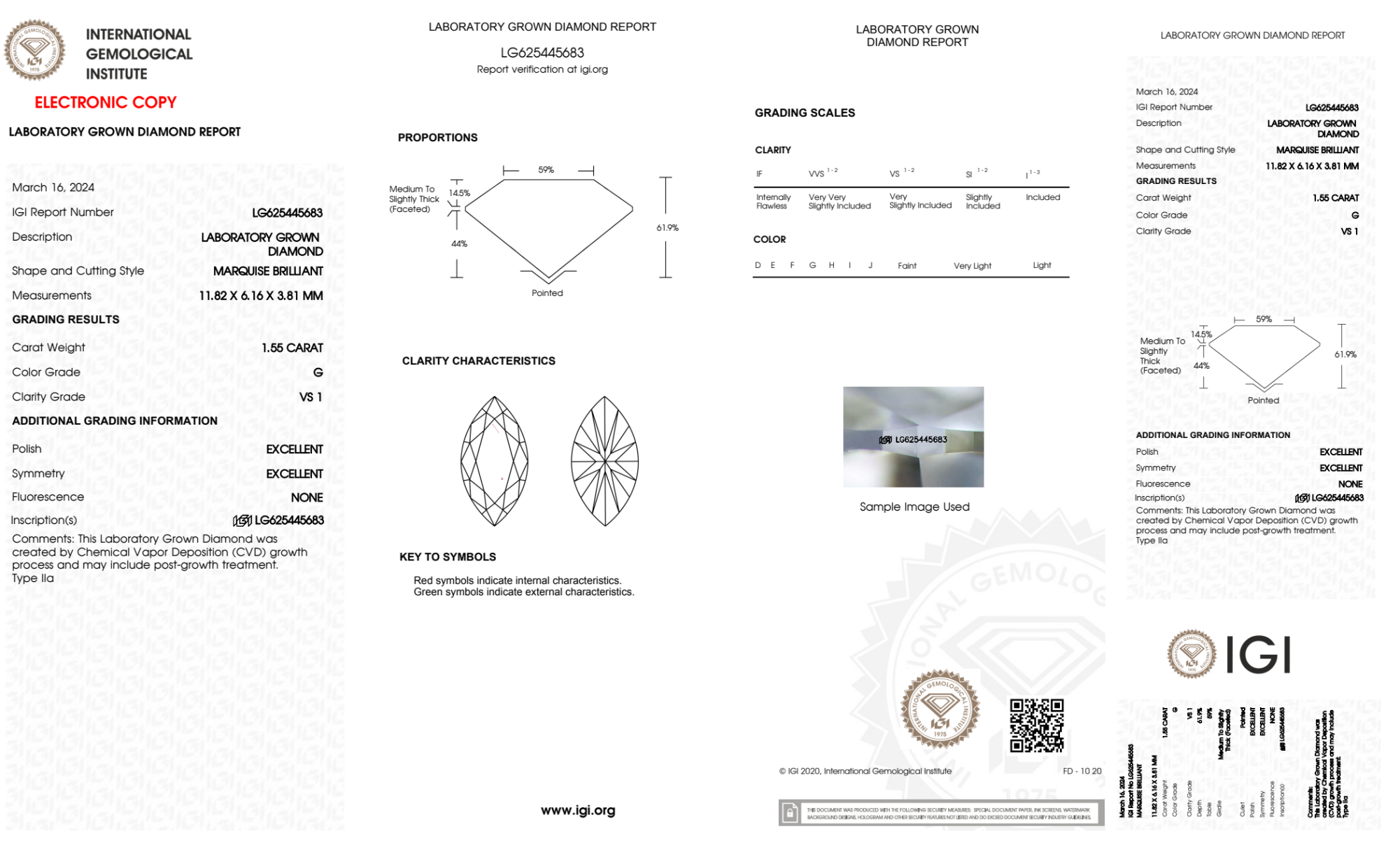 Your 1.55 carat Marquise lab diamond is graded VS1 clarity, which stands for Very Slightly Included 1. Read more about VS1 clarity diamonds here, or learn more about diamond clarity in general here.