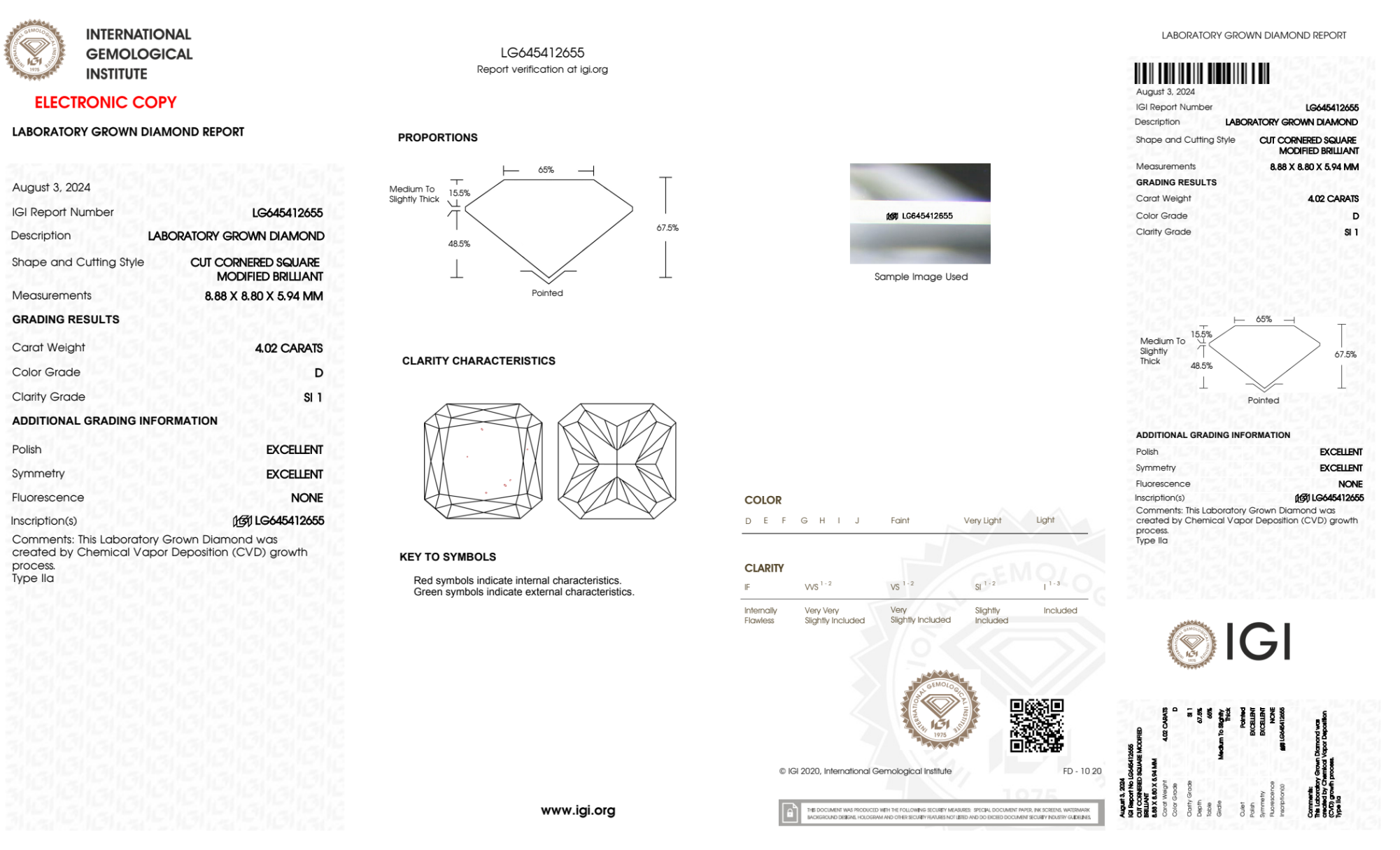 Your 4.02 carat Radiant lab diamond is graded D color (Colorless), and you can read more about D color diamonds here.