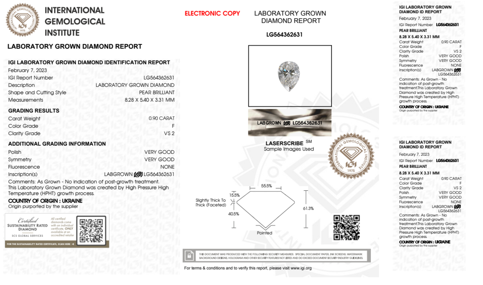 Your 0.90 carat Pear lab diamond is graded F color (Colorless), and you can read more about F color diamonds here.