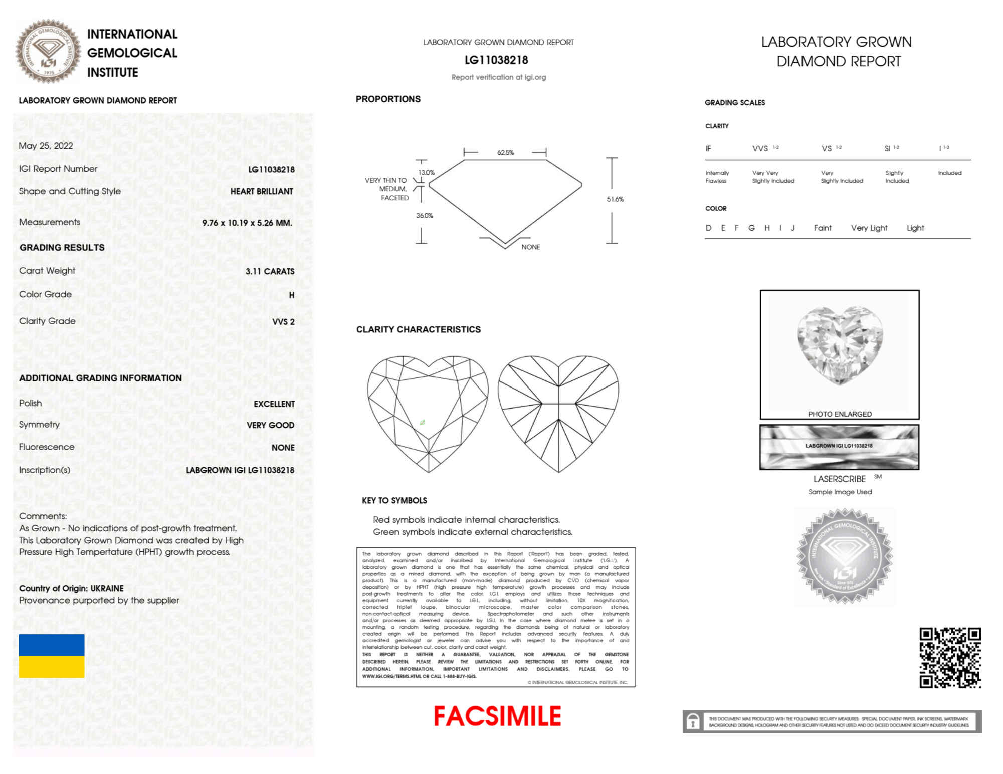 Your 3.11 carat Heart lab diamond is graded H color (Near Colorless), and you can read more about H color diamonds here.