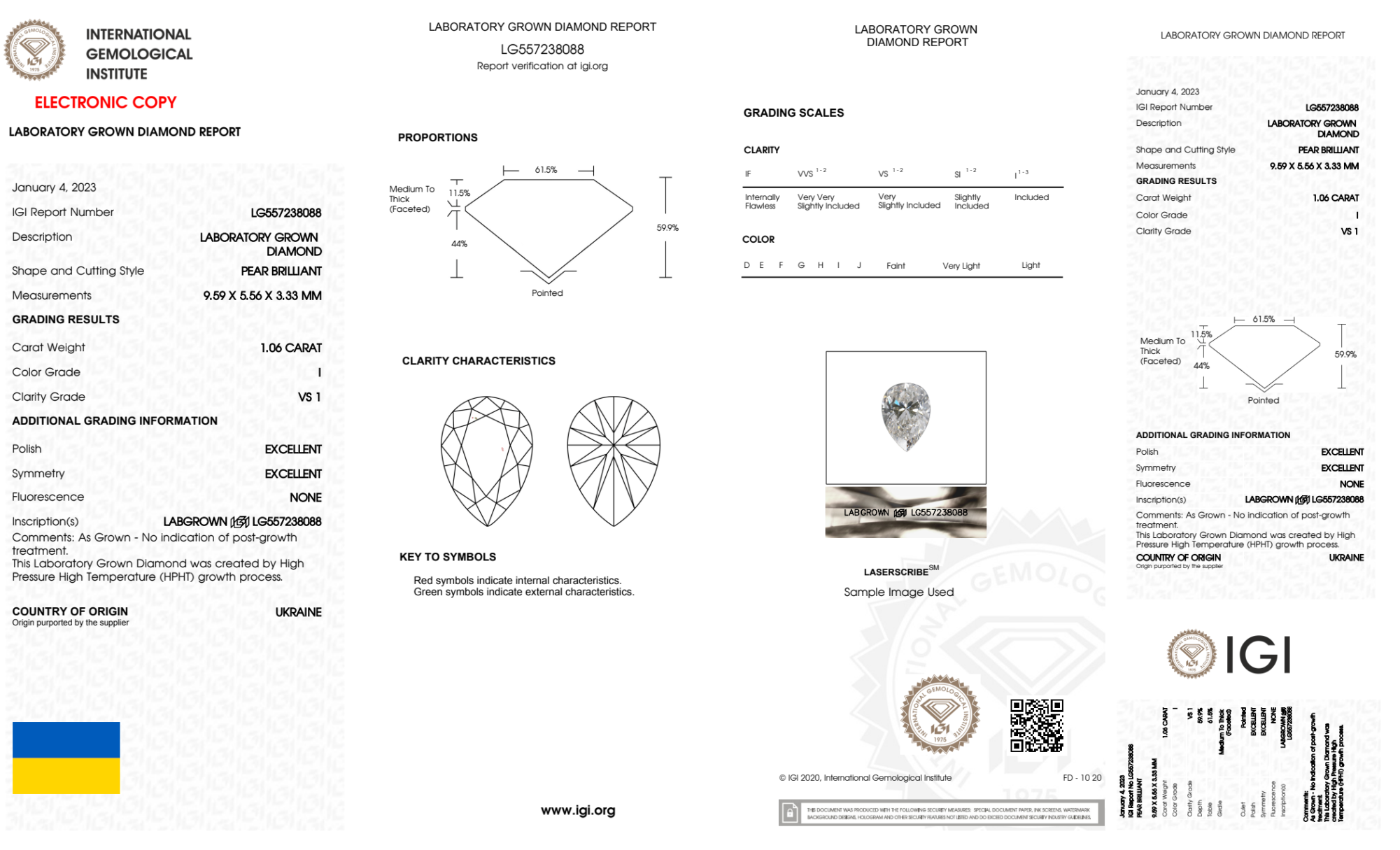 Your 1.06 carat Pear lab diamond is graded I color (Near Colorless), and you can read more about I color diamonds here.