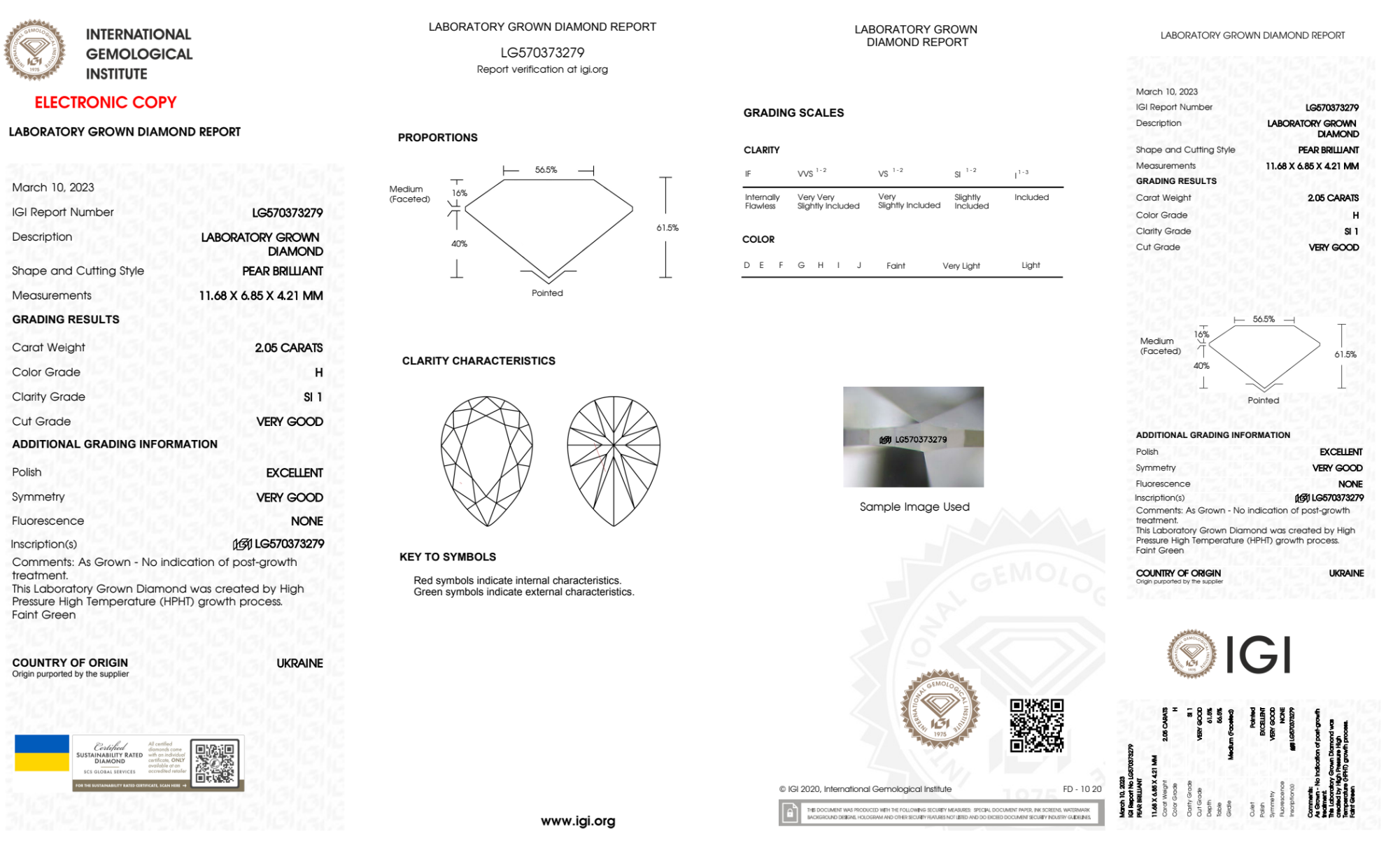 Your 2.05 carat Pear lab diamond is graded H color (Near Colorless), and you can read more about H color diamonds here.